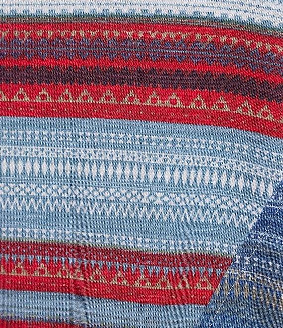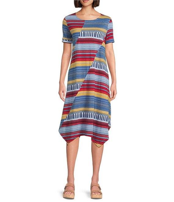 From Multiples, this dress features:Slub knit fabricationFit & flare silhouetteScoop necklineShort cuff sleevesPlacement stripe print Handkerchief hemPullover constructionApprox. to point front 45", front to hem 42", side 35.5" high point shoulder to hemPolyester/spandexMachine wash/tumble dryImported.