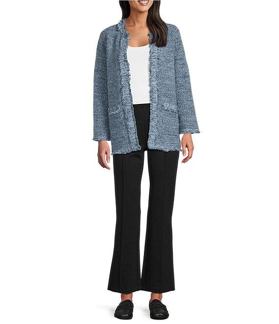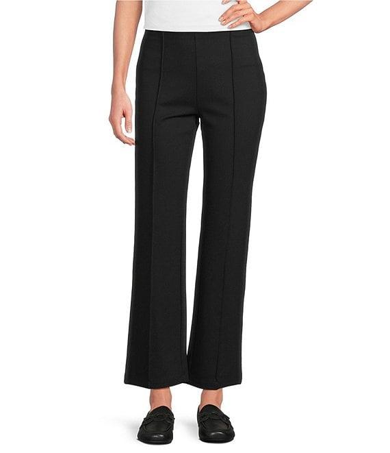 From Multiples, these pants feature: Ponte fabrication Fit & flare silhouette Flat front Pintuck detail Straight hem Pull-on construction Approx. 29" length, 18" leg opening Approx. 11.25" front rise, 16.25" back rise Rayon/nylon/ elastane Machine wash Imported.