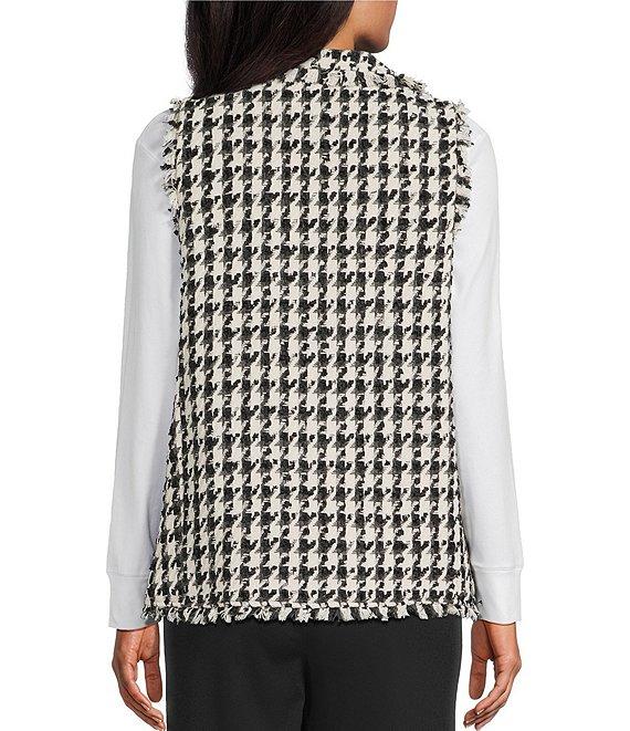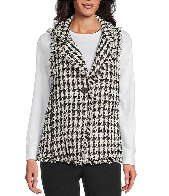 From Multiples Petite, this vest features: Textured woven fabrication Notch lapel collar Sleeveless Fitted Checked pattern Princess seam detail Fringe detail Side seam pockets Straight hem with fringe detail One front button closure Approx. 28" length Polyester/cotton/viscose/acrylic/nylon Place in garment bag-machine wash cold Imported.