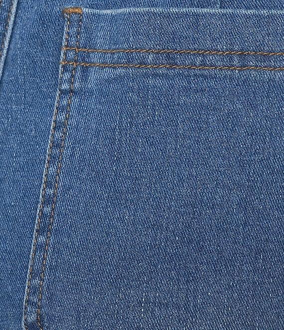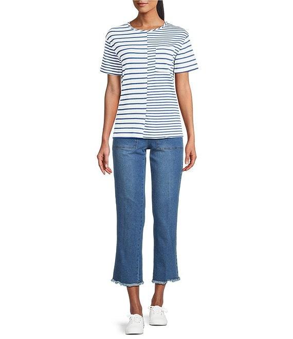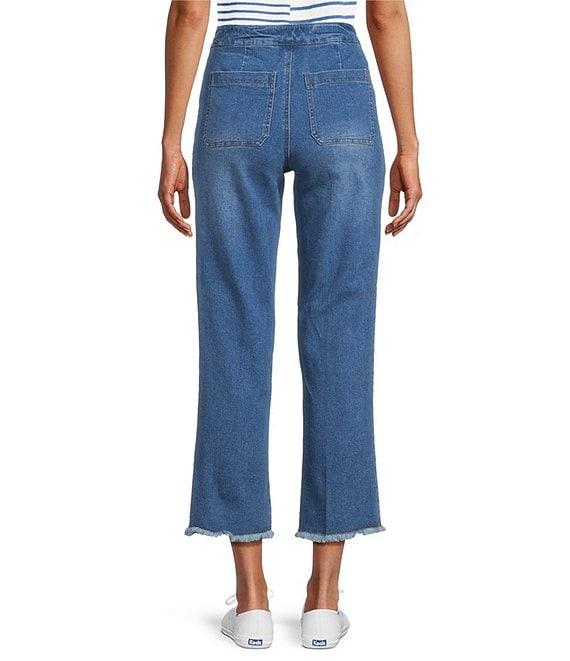 From Multiples, these jeans feature: Stretch denim fabrication Elastic waistband Functional front & back pockets Wide-leg Crop length Straight hem with fringe detail Faux fly front Pull-on construction Approx. 26" inseam,17" leg opening Approx. 11.5" front rise, 16.5" back rise Cotton/spandex Machine wash Imported.