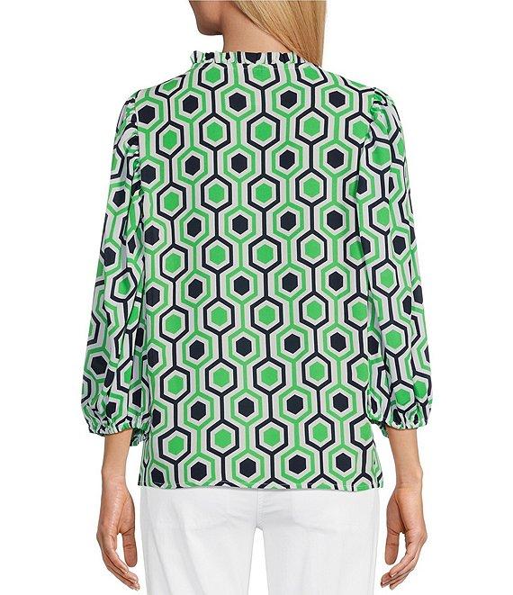 From Multiples, this top features: Woven fabrication Split v-neckline with ruffle detail 3/4 puff sleeves Elastic shirred front detail Fitted Straight hem with side vents Pullover construction Approx. 26" front Polyester Machine wash/tumble dry Imported.