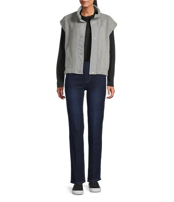From Multiples, this vest features: Woven fabrication Stand collar Sleeveless Fitted Two front pockets Straight hem Snap-front closure Approx. 24" length Polyester/nylon Machine wash Imported.