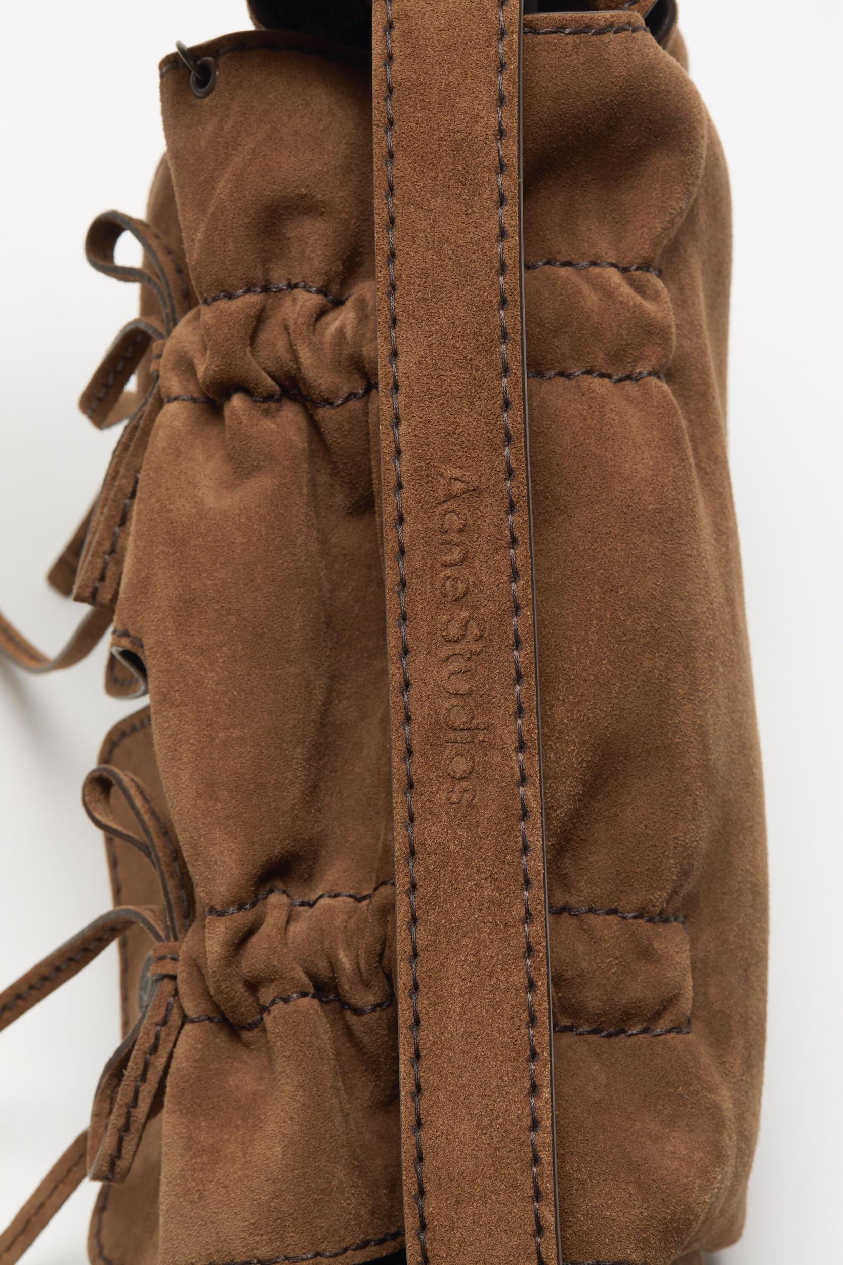 Multipocket shoulder bag crafted from soft split leather with a multi-pocket construction and spacious interior. Features a top handle and adjustable shoulder strap, accented with jean-inspired rivets and knot details on the pockets, secured with magnetic closures. Multipocket Suede S