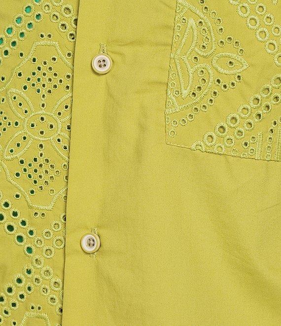 From Murano's Crocodile World Collection, this shirt features:Contrast eyelet patternCamp collarShort sleevesFull button-front closureLeft side chest pocket Slim fitCottonMachine wash/tumble dryBandana gift with purchaseImported.
