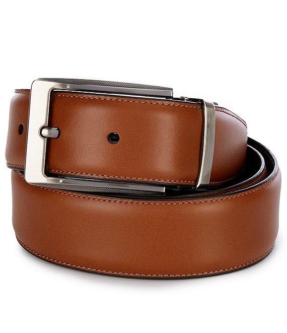 From Murano, this belt features: Brown reversing to black Feather edge with stitch Nickel brushed swivel buckle Approx. 35mm Smooth full-grain cowhide lined on genuine leather Spot clean Imported. Suggested belt size: Take your existing pants size and add two inches. E.g. if your pants size is 32, purchase a size 34.