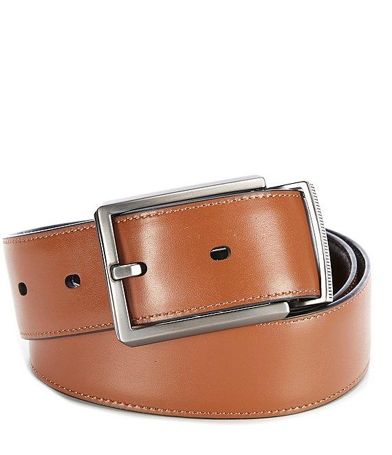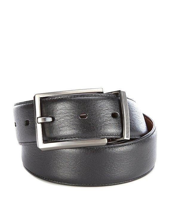 From Murano, this belt features: solid strap construction with stitching reversible leather tipped standard buckle in gunmetal finish approx. 35mm leather spot clean Imported. Suggested belt size: Take your existing pants size and add two inches. E.g. if your pants size is 32, purchase a size 34.