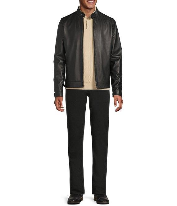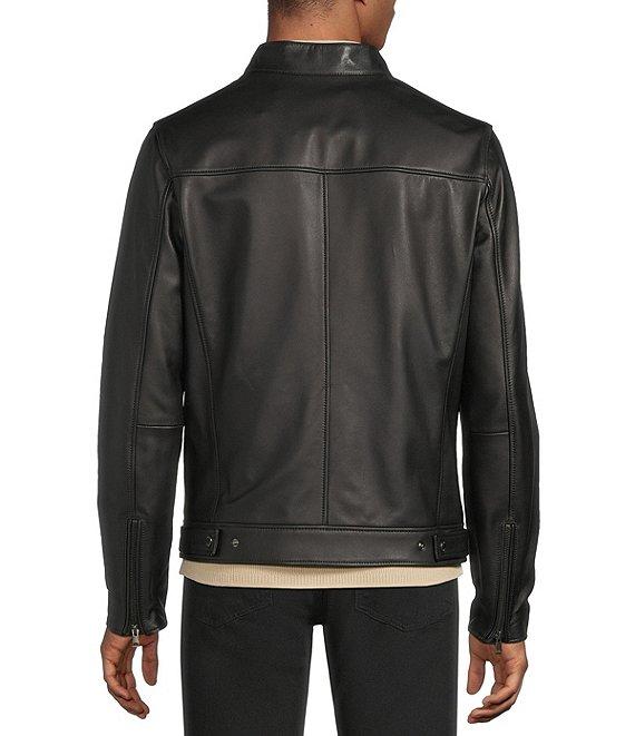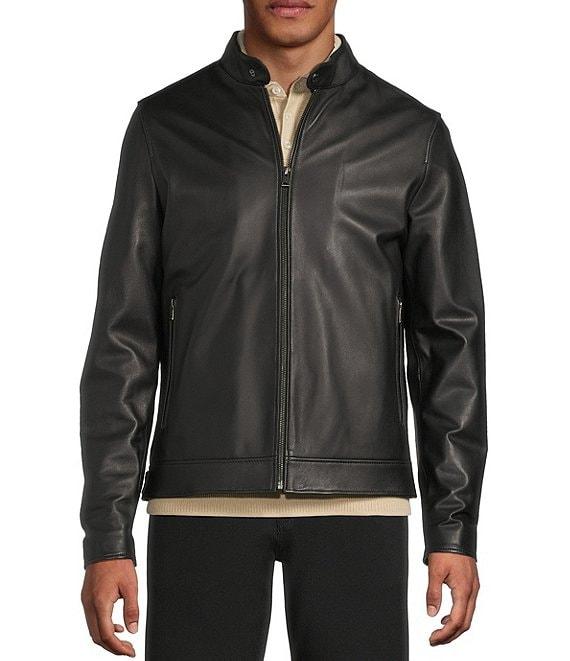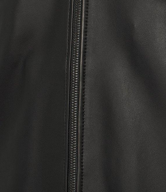 From Murano, this jacket features: Lambskin leather Stand collar with throat latch and snap closure Long sleeves with zipper vent detail Zip-front closure Snap tabs for an adjustable waist Front hip zipper pockets 1 interior pocket Smooth finish Lambskin leather Professional leather clean Imported.