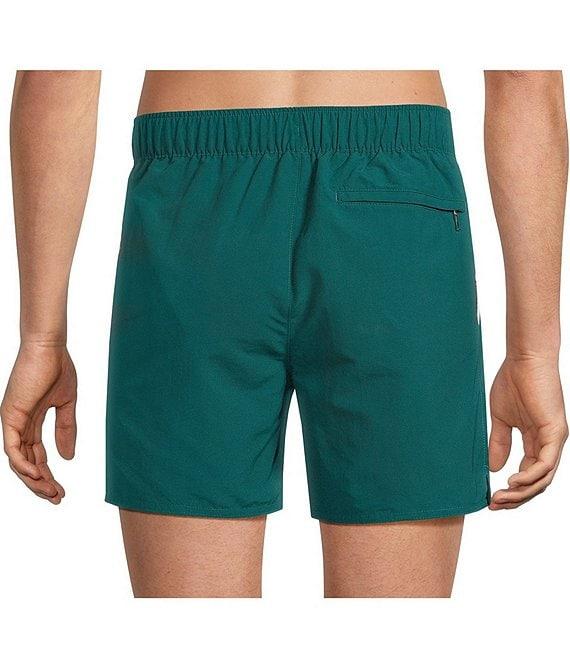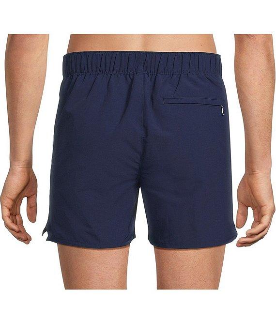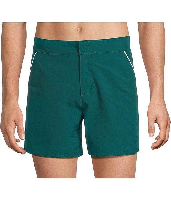 From Murano, these trunks feature: Making waves in modern swimwear 5” inseam Mesh brief liner Half elastic waistband with snap closure Zip front-fly with interior drawcord Side entry pockets Welt back pocket with zip closure Interior coin pocket Nylon Machine wash warm/tumble dry Imported.