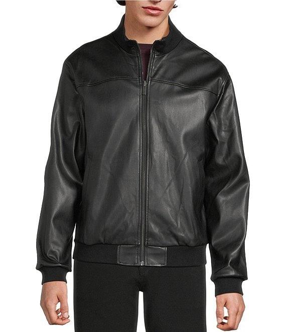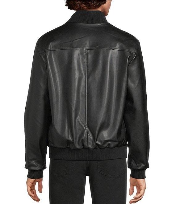 From Murano, this jacket features: Reversible navy nylon second side Ribbed stand collar with tipping detail Long sleeves with ribbed cuffs Zip-front closure Ribbed hem Front hip angled pockets on both reversible jacket sides Faux leather Nylon/spandex Machine wash warm/tumble dry Imported.