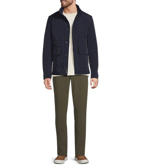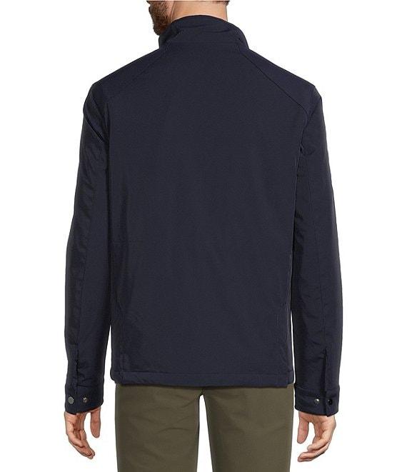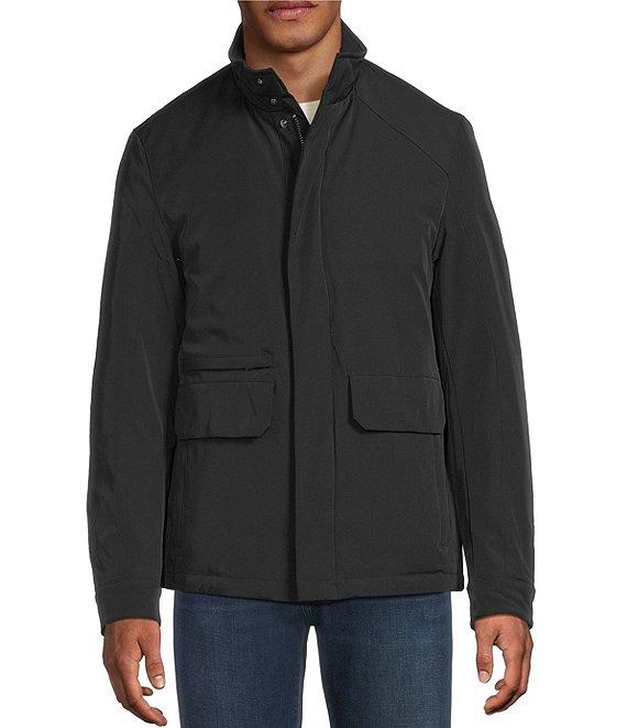 From Murano, this jacket features: Stand collar with knit detail Modern fit, mid-length Primaloft® fill Full-zip front and storm flap with snap Front hip pockets with zip closure, flap pockets with snap closure, and a welt ticket pocket Interior snap pocket Adjustable sleeve cuffs with snaps and bungee waist Back vents with snaps Machine wash cold/tumble dry Imported.