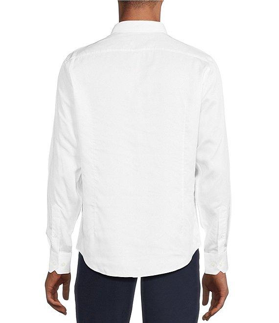 From Murano, this shirt features: Solid tone Spread collar Long sleeves Button-front closure Curved hem Slim fit Lyocell Machine wash/tumble dry Imported.