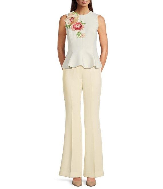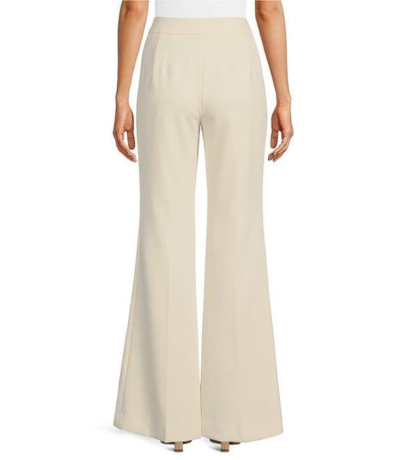 From Muse by Marchesa, these pants feature: Stretch crepe fabrication Flare silhouette Straight hemline Pull-on construction Front zipper and hook closure Approx. 32.5" in length, 9.5" front rise, 12.5 leg opening Polyester/elastane Dry clean Imported.