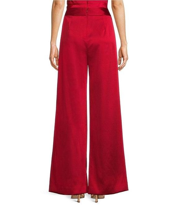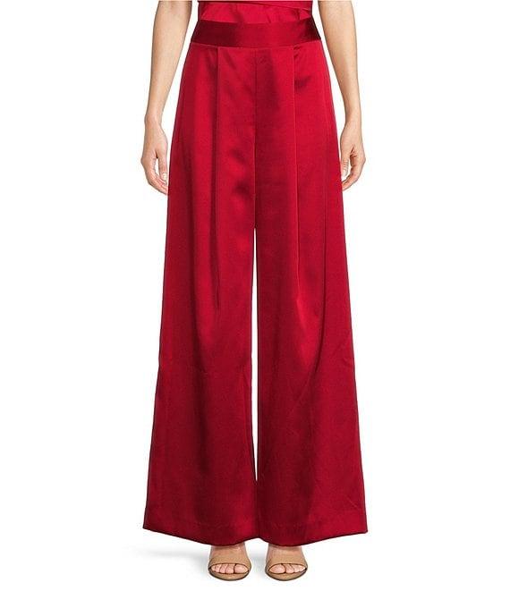 From Muse by Marchesa, these pants feature: Satin fabrication Flat front silhouette High rise waistline Fully lined Straight hemline Full length Pull-on construction Side seam zipper with hook & eye closure Approx. 31.25" in length Approx. 10.375" inseam Approx. 13.375" front rise Polyester, elastane Professional dry cleaning only Imported.