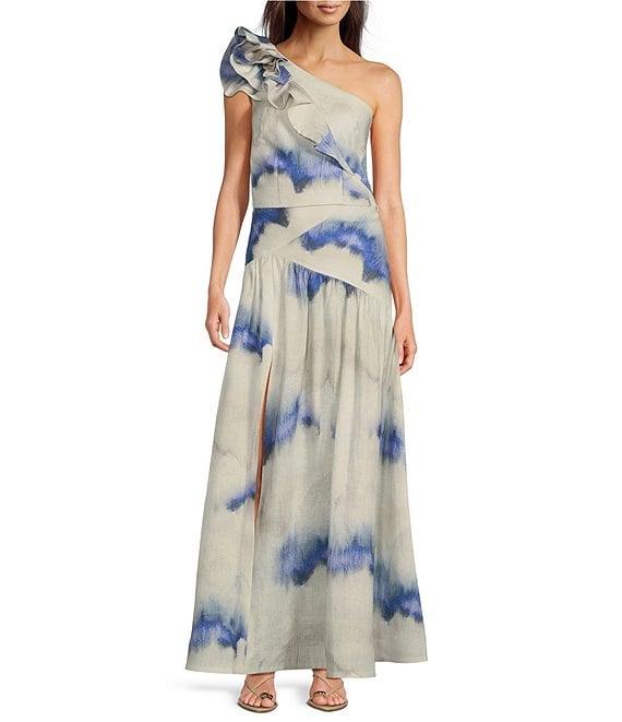 From Muse by Marchesa, this set features:Top:Printed linen fabricationBlouse silhouetteOne shoulder necklineSleevelessApplique detailSide zip closureApprox. 8.25" in lengthLinenDry cleanSkirt:Printed linen fabricationA-line silhouetteStraight hemlineSide zip and hook closureApprox. 41" in lengthLinenDry cleanImported.