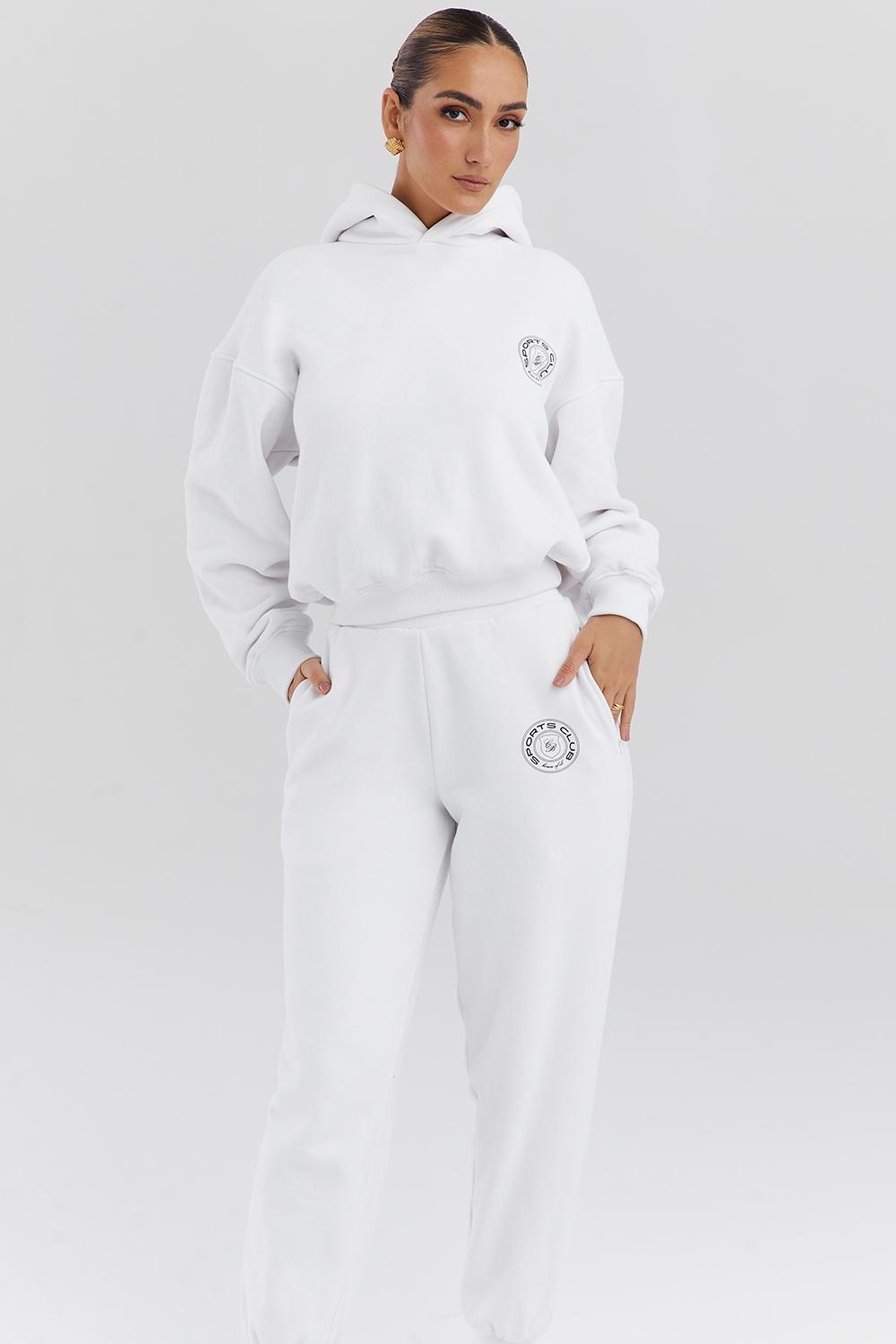 Our 'Muse' hoodie is made from an ultra soft cotton fleece back jersey and designed for a relaxed fit. The cross front hood keeps you warm in the coldest weather and 'Muse' is aesthetically cool, embroidered with our new and unique HOCB Sports Club logo to the chest. Finished with a ribbed hem and cuffs, wear yours with our 'Coast' joggers in white for a comfy, casual look.