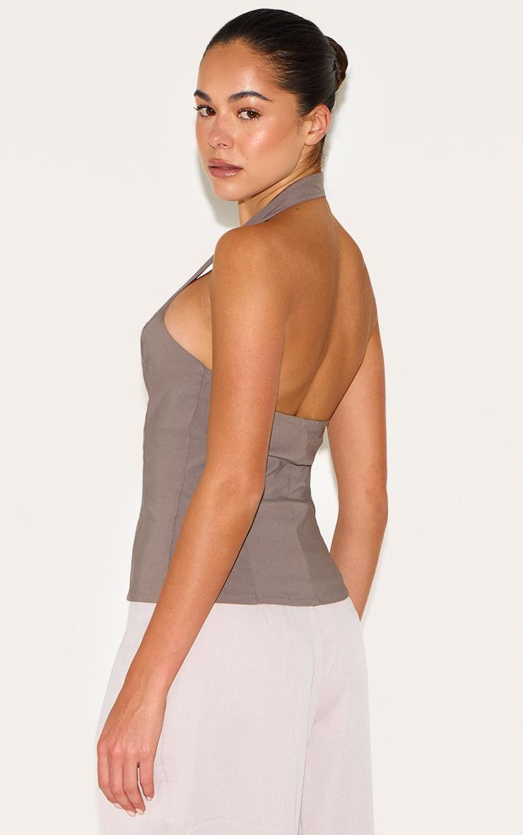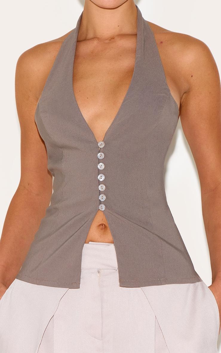 Brought to you in mushroom hue bengaline material with pearlescent button fastenings, a deep V halterneck and a chic hip length fit. For an elevated look, combine this mushroom bengaline button up halterneck long top with neutral tailored wide leg pants, chic kitten heels and your staple shoulder bag.Length approx 48.5cm/19inch (Based on sample size US 4)Model wears size UK 8/ EU 36/ AUS 8/ US 4Model Height - 5ft 8inchp]:!mb-4inch>Brand: PrettyLittleThingCategory: TopsProduct type: Cami TopColor: MushroomMaterial: BengalineDesign: PlainNeckline: HalterneckSleeves: SleevelessOccasion: Day