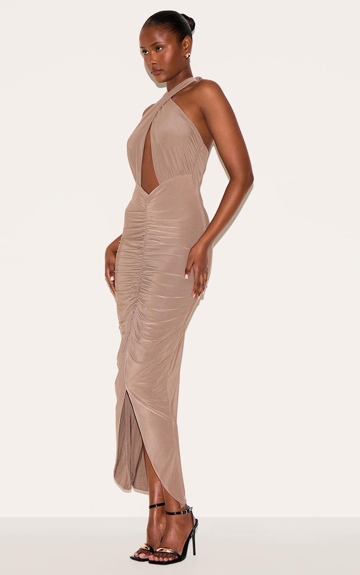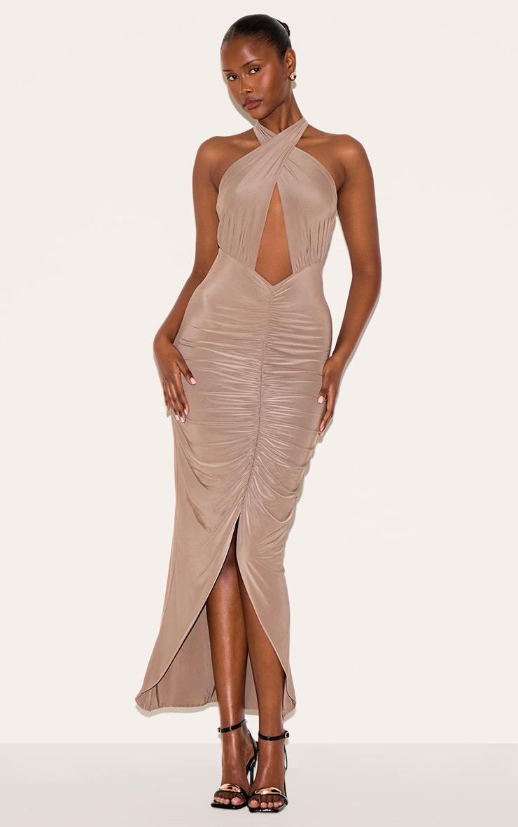 Brought to you in a mushroom doubled layered hue with a flattering ruched detail and a cut-out maxi style fit. Style this must have mushrrom double layered cut out ruched maxi dress with slip on heels and gold accessories for a look that will turn heads.Length approx 151cm/59.5inch (Based on sample size US 4)Model wears size UK 8/ EU 36/ AUS 8/ US 4Model Height - 5ft 9inchp]:!mb-4inch>Brand: PrettyLittleThingCategory: DressesProduct type: Bodycon DressColor: MushroomMaterial: Slinky JerseyDesign: PlainNeckline: HalterneckSleeves: SleevelessOccasion: Evening
