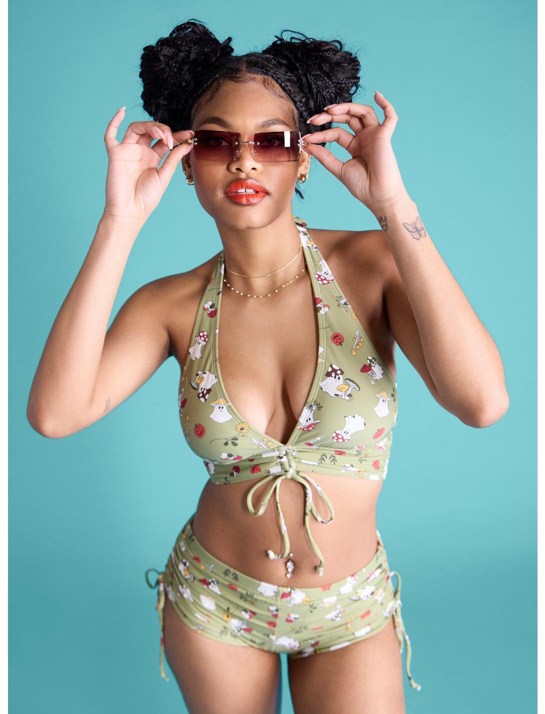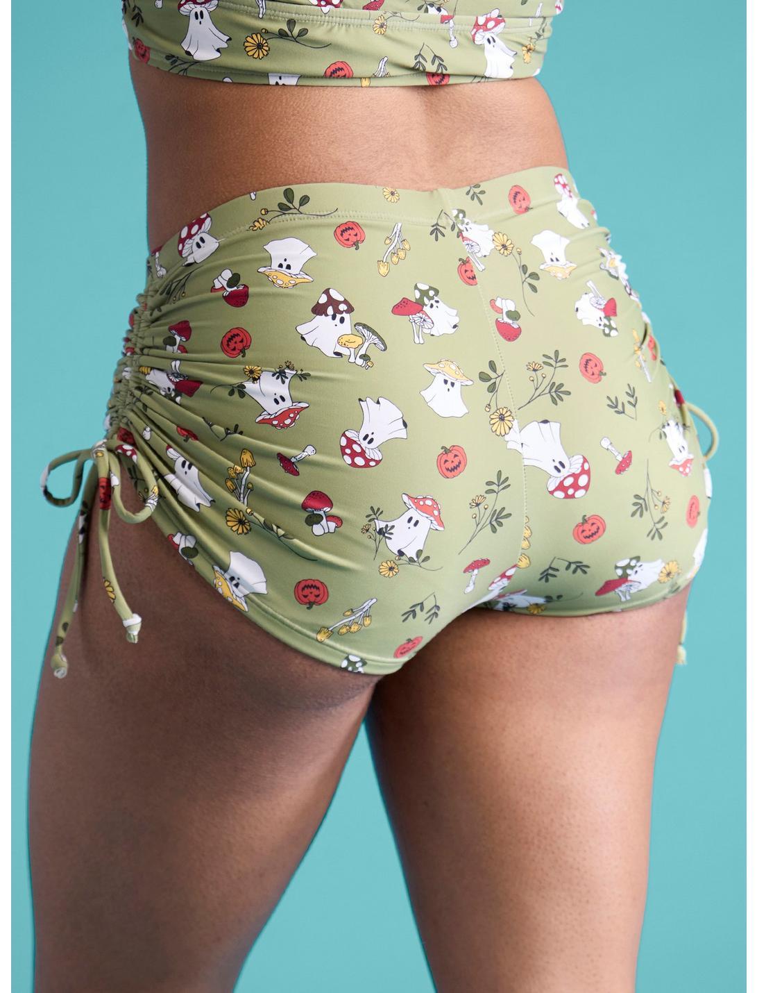 Hey, boo! Haunt the shores during your next beach trip in these spooky swim bottoms! Featuring an allover print of mushroom ghosts, jack-o'-lanterns and foliage. Comes with ruching on the sides and tie detailing. Pair them with the matching top for the ultimate hot ghoul summer vibe!Top not included.Swimwear can only be returned unworn with original tags intact and sanitary panel in place.82% nylon; 18% spandexHand wash cold; dry flatImportedListed in junior sizesModel wears size Small