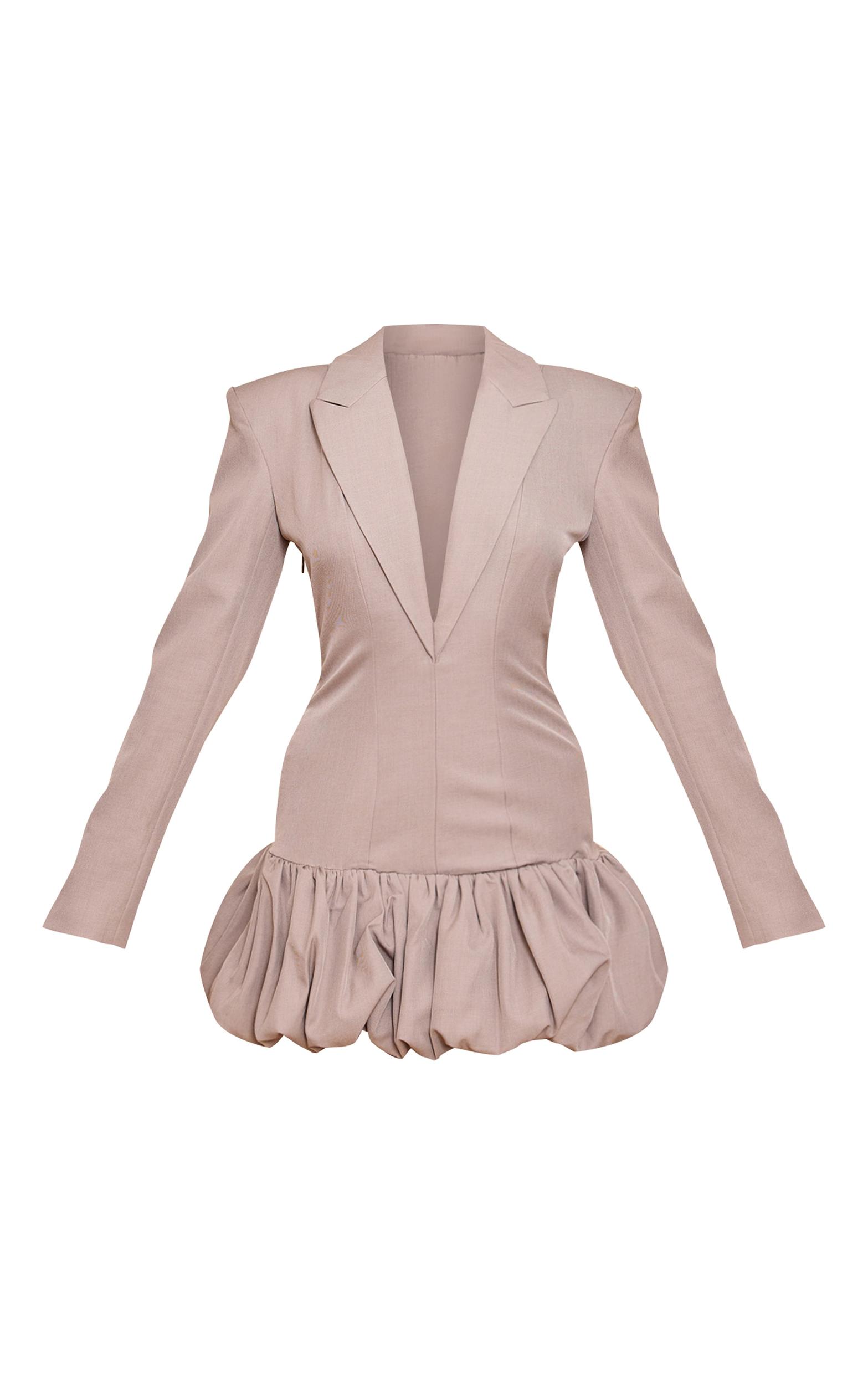 Confidence is always in style; this look seals the deal. The mushroom plunge puff hem blazer dress redefines occasionwear with its sharp, tailored top, featuring a striking deep V-neckline and structured shoulders that lead into a cinched waist. Its truly distinctive feature is the voluminous, ruched puff hem that adds a playful yet sophisticated edge to the silhouette. Complete this eye-catching piece with sleek pointed heels and a bold clutch for an evening aesthetic that’s undeniably yours.Length approx 81.5cm/32inch (Based on sample size US 4)Model wears size UK 8/ EU 36/ AUS 8/ US 4Model Height - 5ft 9inchp]:!mb-4inch>Brand: PrettyLittleThingCategory: DressesProduct type: Blazer DressColor: MushroomMaterial: Tailored WovenDesign: PrintNeckline: PlungeSleeves: LongOccasion: Evening