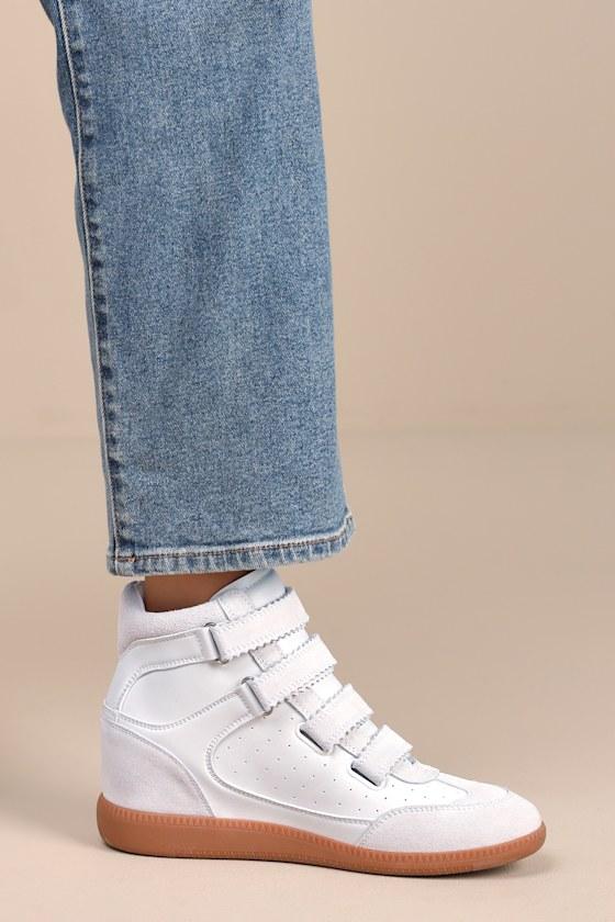 Add the cutest (and most practical) pep to your step with the Steve Madden Mustang White Suede High-Top Wedge Sneakers! Smooth faux leather and faux suede come together to shape these elevated sneakers with a rounded toe and a high-top vamp that secures with scalloped, adjustable VELCRO® straps. Perforated details accent the instep and outstep, while a hidden wedge offers some extra height atop the contrasting brown sole.