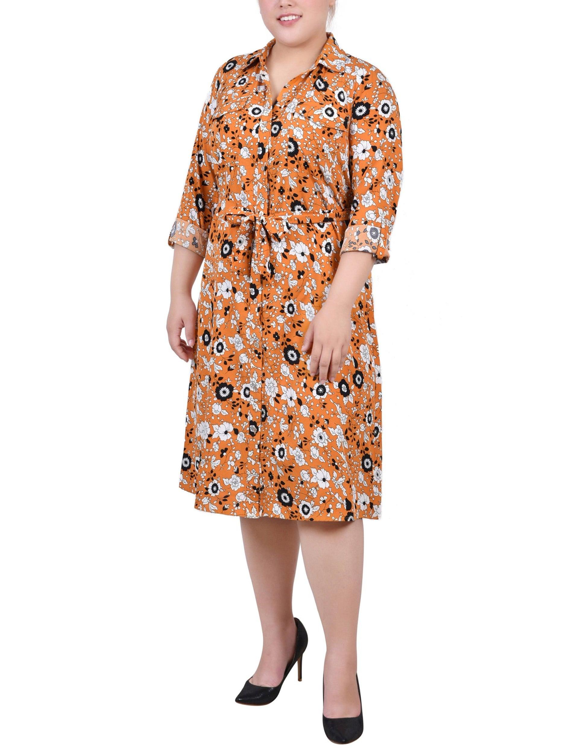 Circle Chain 3/4 Roll Tab Sleeve Belted Shirtdress - Plus