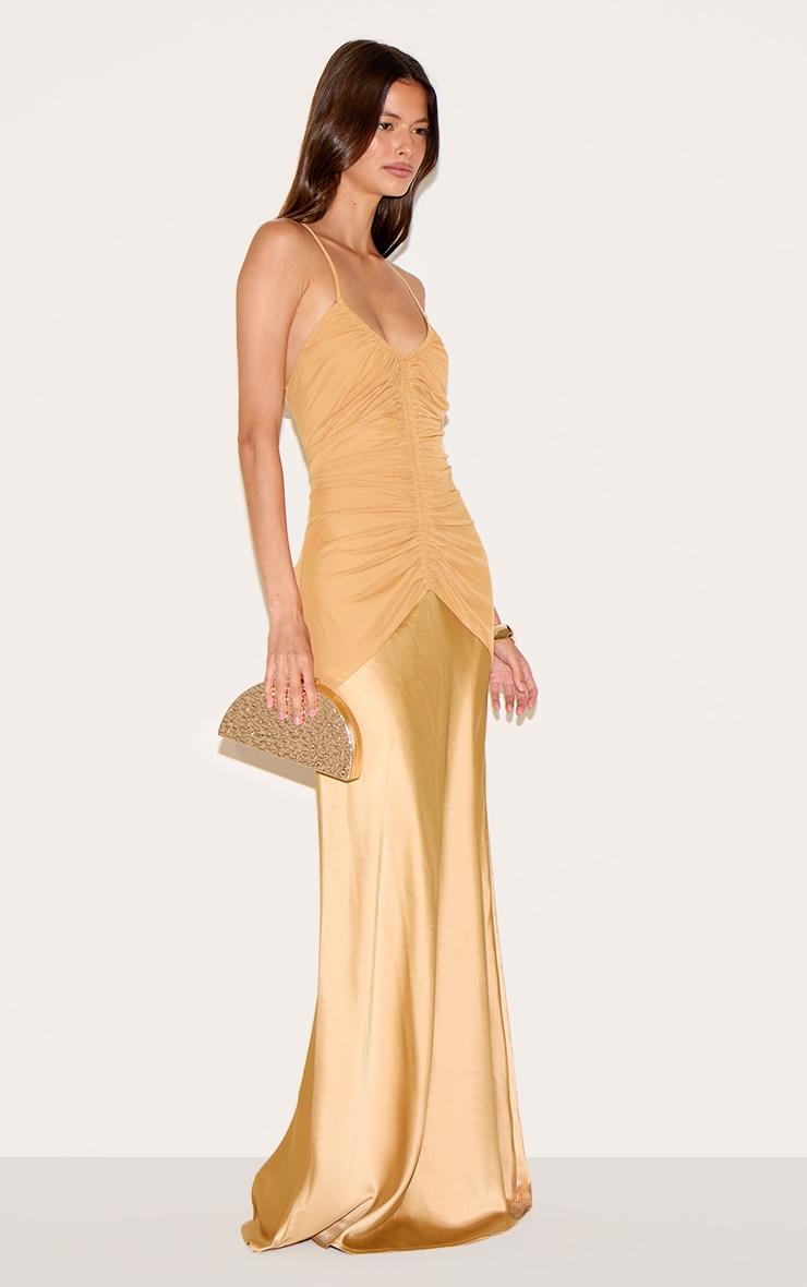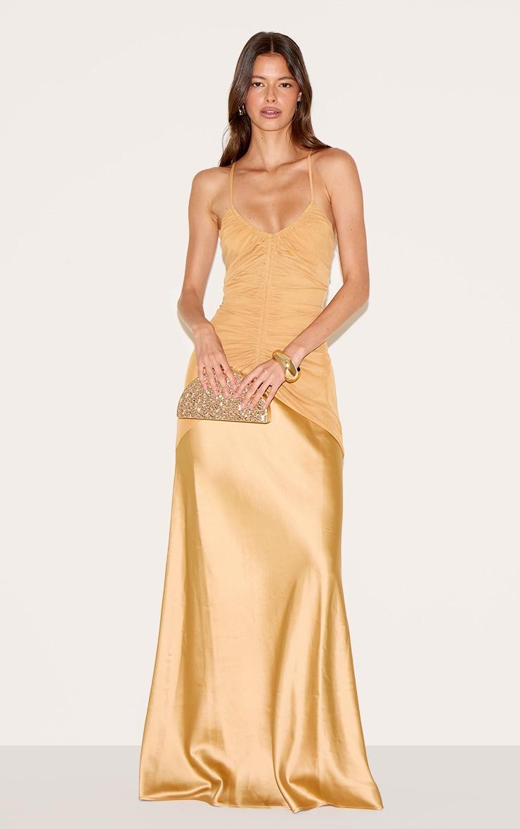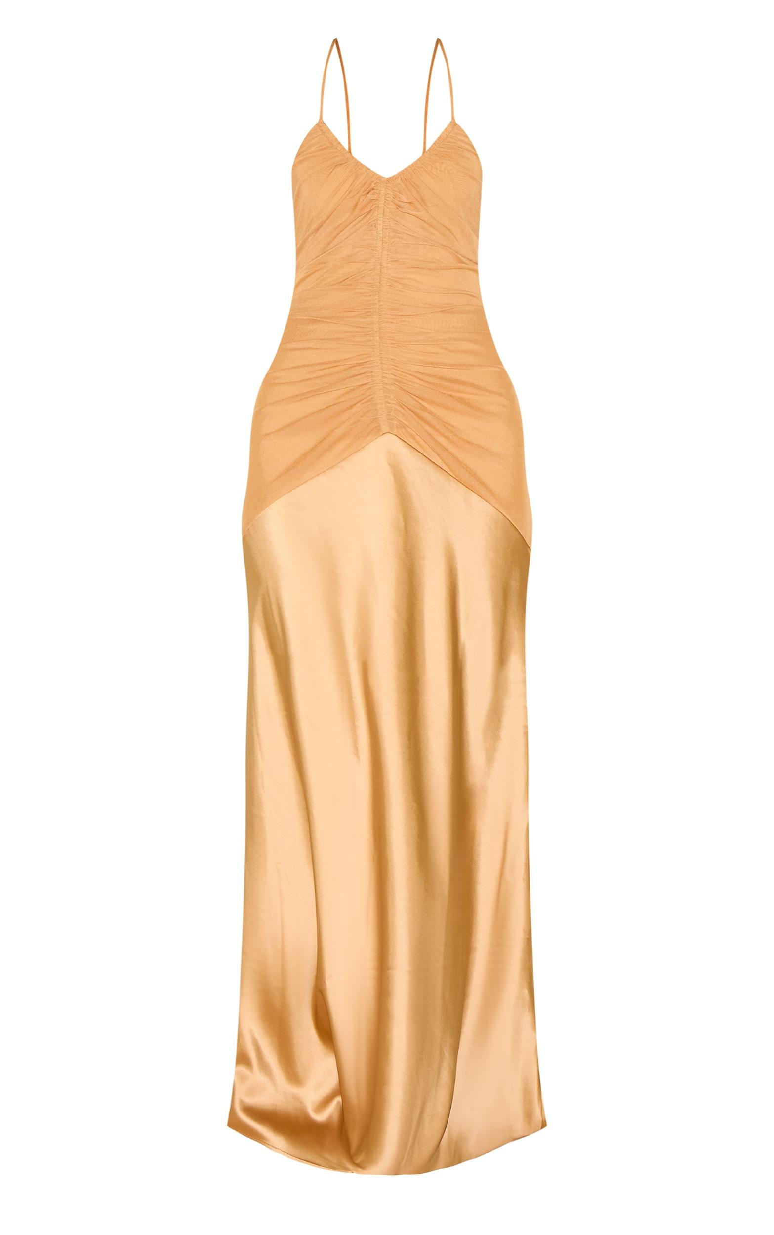 For a knowing take on after-dark sophistication, look no further. The mustard ruched detail satin maxi slip dress delivers a confident aesthetic with its delicate spaghetti straps and a softly draped v-neckline, while the precise ruched detailing across the bodice creates an artful focal point, leading into a sweeping maxi length that elongates the frame. This piece ensures a graceful drape for every move. Perfect for an elevated evening, simply complement with a bold gold cuff bracelet and a chic clutch bag, finishing with sleek heeled sandals. It's the ultimate piece for a confident, knowing, after-dark look.Length approx 155cm/61inch (Based on sample size US 4)Model wears size UK 8/ EU 36/ AUS 8/ US 4Model Height - 5ft 7inchp]:!mb-4inch>Brand: PrettyLittleThingCategory: DressesProduct type: Slip DressColor: MustardMaterial: SatinNeckline: PlungeSleeves: SleevelessOccasion: Evening