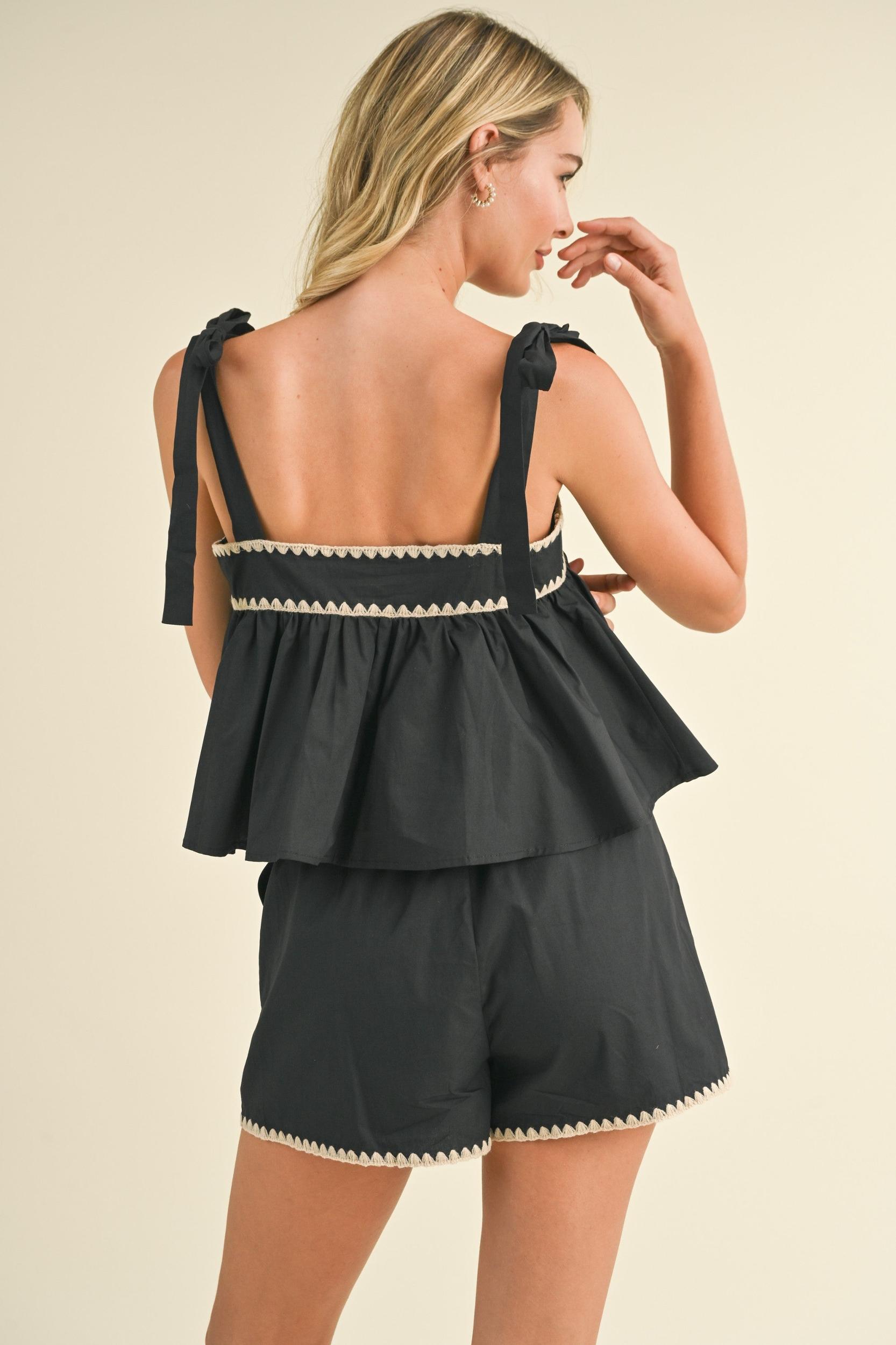 Step into sunshine and summer vibes with our adorable tie shoulder top and shorts set, featuring the most delicate scallop stitch trim! 😍 This dreamy ensemble is perfect for those warm days when you want to be both comfortable and stylish.
