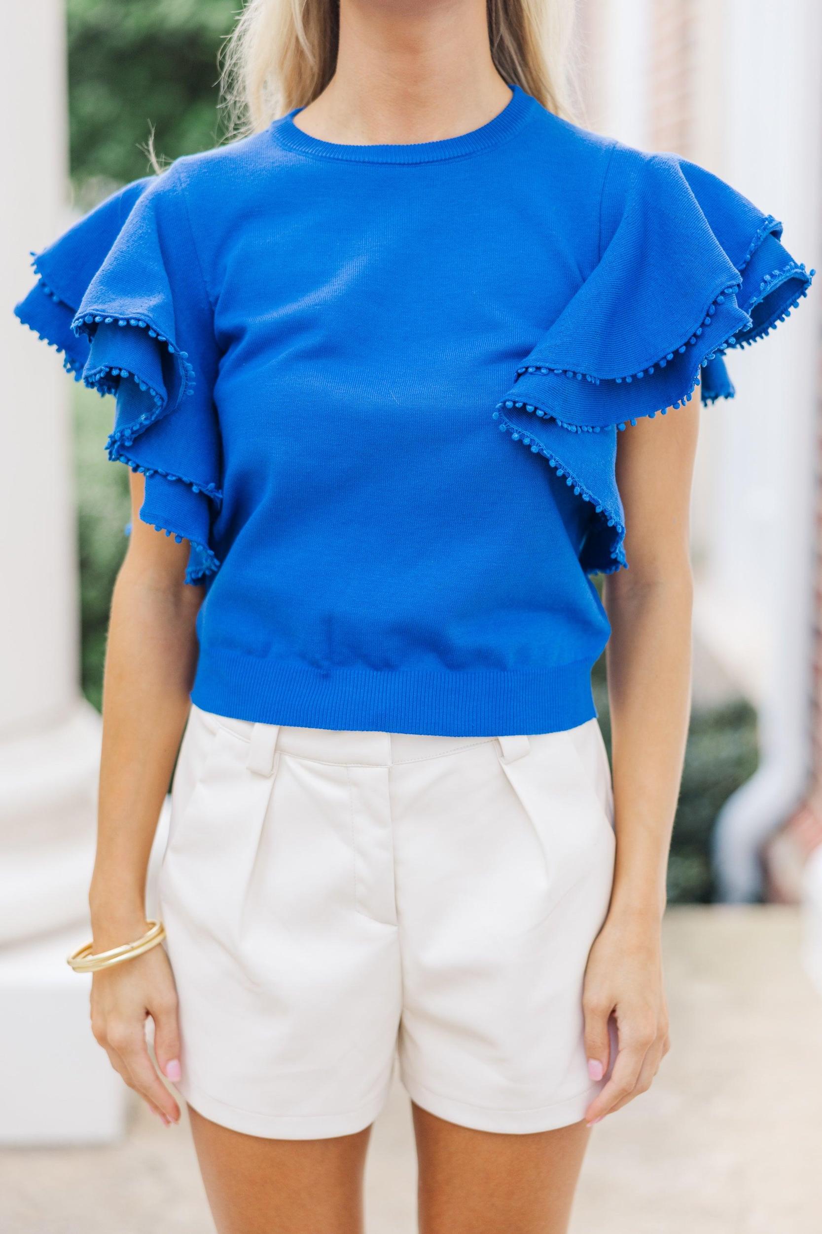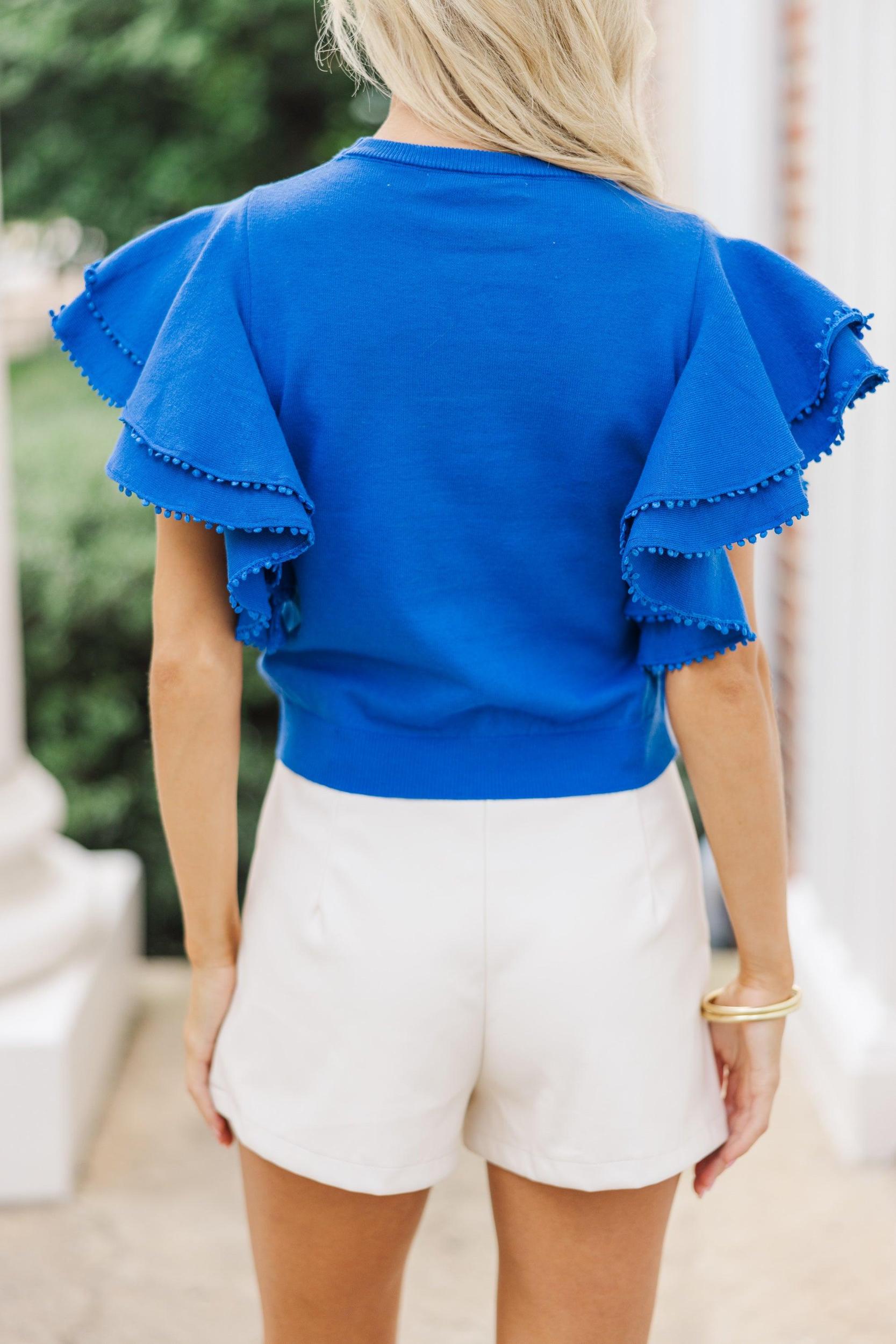 You are going to fall head over heels for this short sleeve sweater! That ruffled detailing is so feminine and we love the pompom trim. This sweater is going to look great with your favorite jeans for game days or trousers for work. Round neckline Short ruffled sleeves Pompom trim Generous stretch Baileigh is wearing the small.
