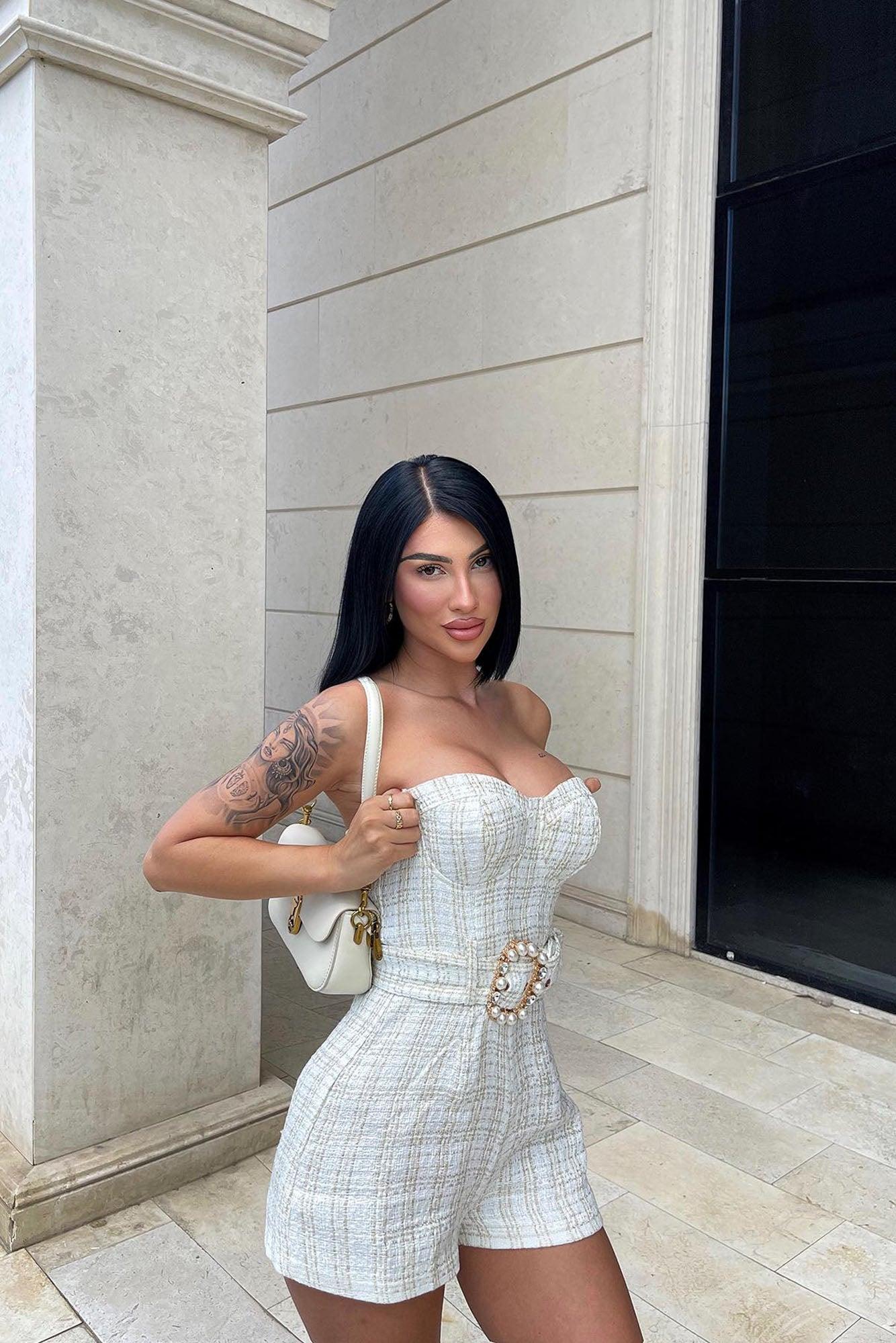 Available In Cream. Tweed Romper Sweetheart Belted Buckle Detail Hidden Back Zipper Non Stretch Self: 100% Polyester Lining: 100% Polyester Imported California Proposition 65WARNING: Cancer and Reproductive Harm - www.P65Warnings.ca.gov.