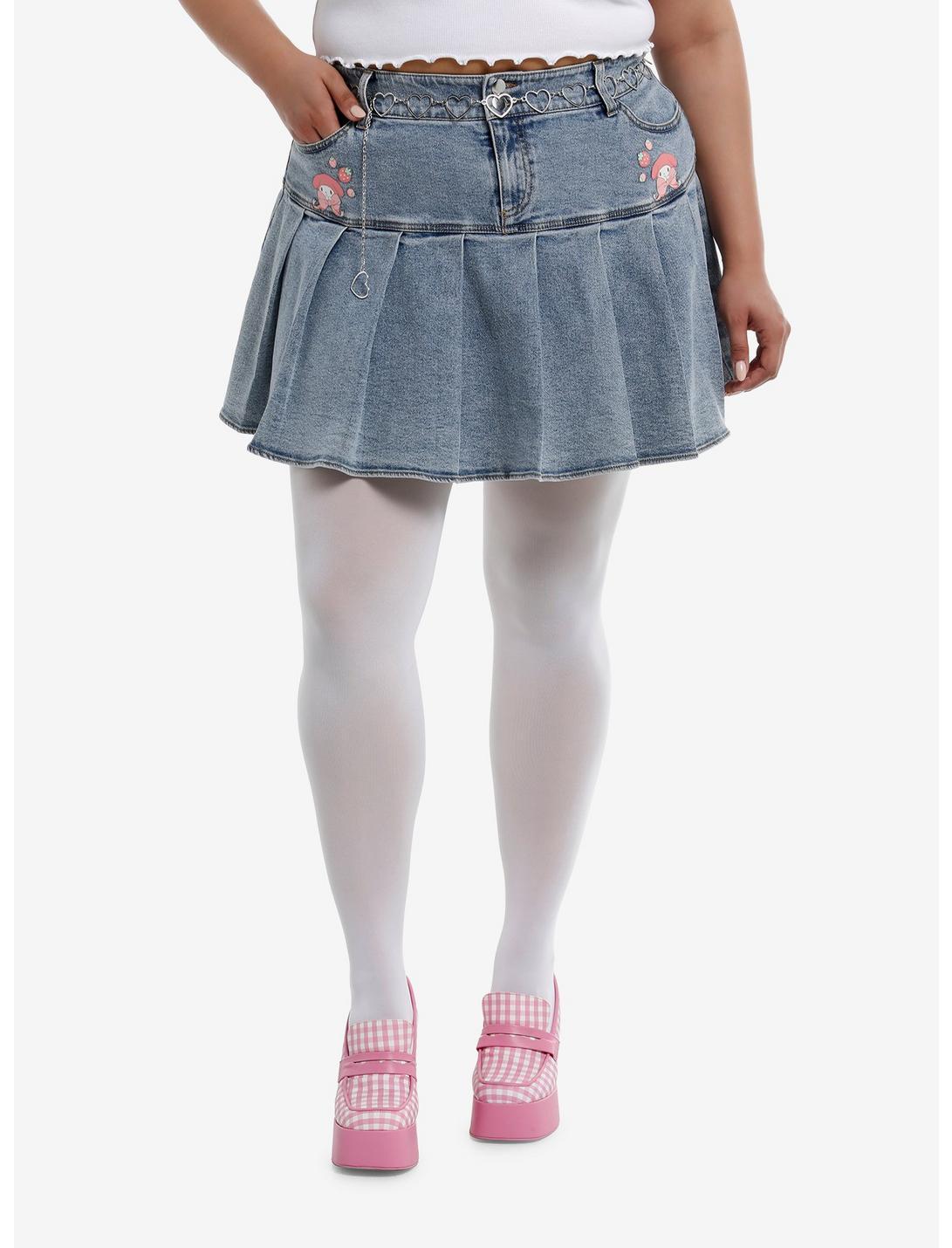 Keep it kawaii with this Sanrio denim skirt! It features prints of My Melody with strawberries and ribbons printed under the pockets, plus pleats at the skirt. Comes with a removable heart chain belt.99% cotton; 1% spandexWash cold; dry lowHeart chain beltImportedModel is 5'10"Model wears size 1