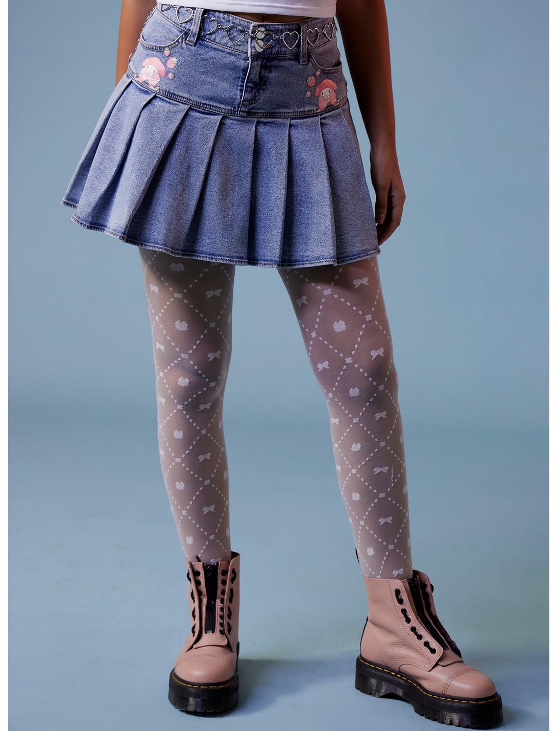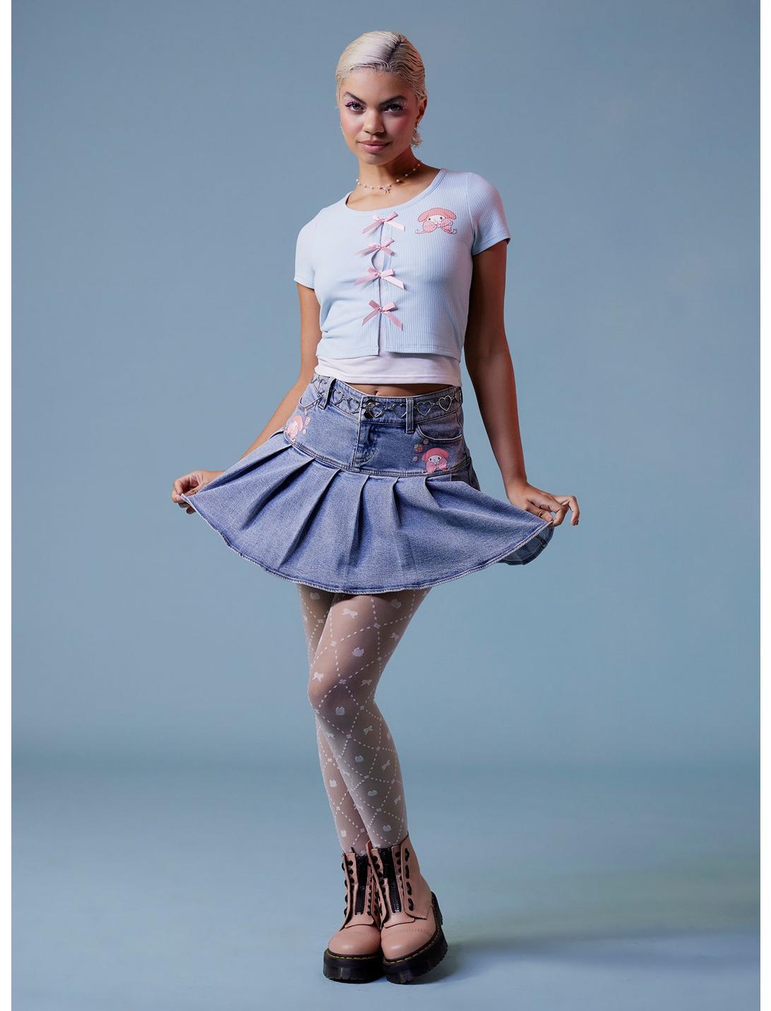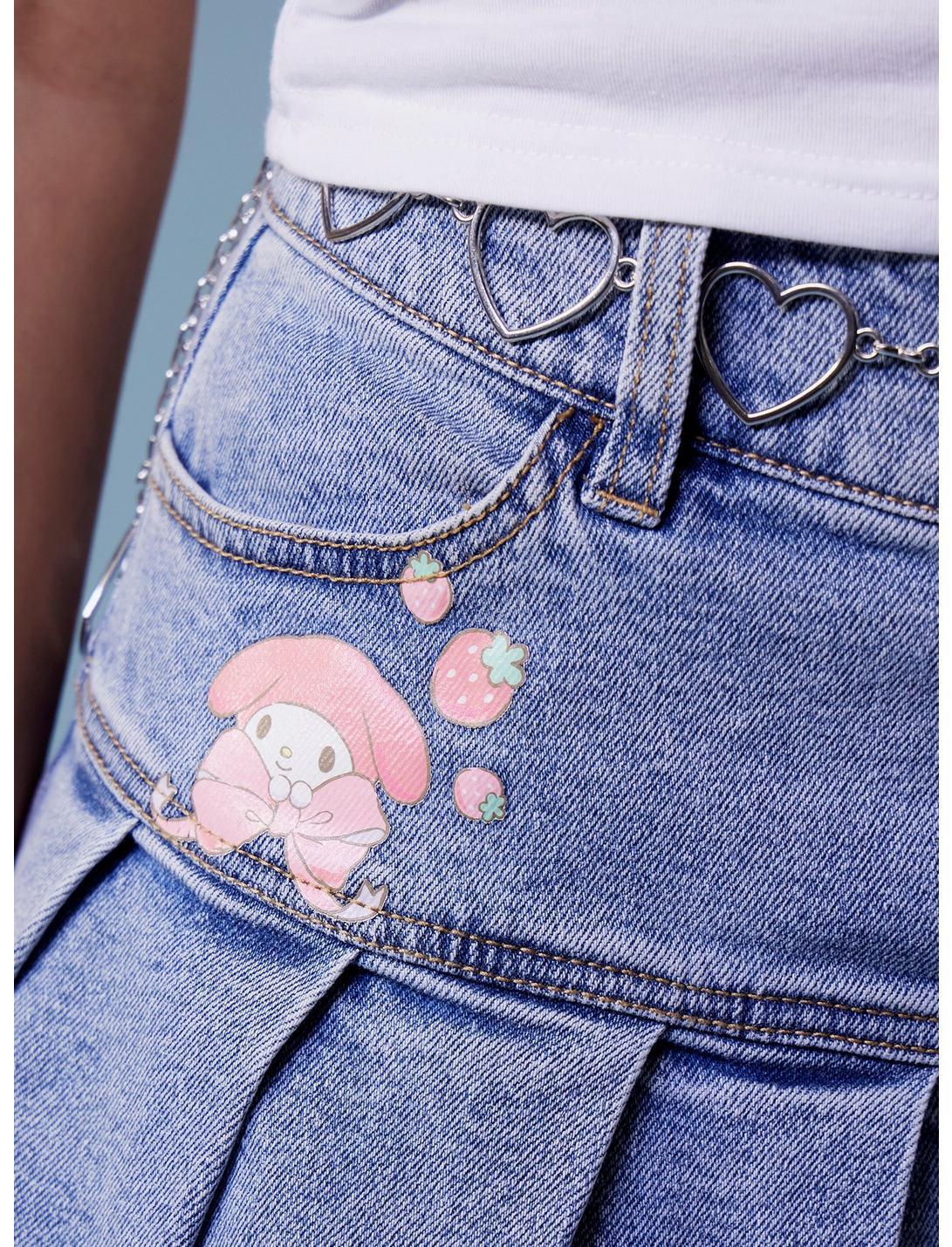 Keep it kawaii with this Sanrio denim skirt! It features prints of My Melody with strawberries and ribbons printed under the pockets, plus pleats at the skirt. Comes with a removable heart chain belt.99% cotton; 1% spandexWash cold; dry lowHeart chain beltImportedListed in junior sizesModel wears size Small