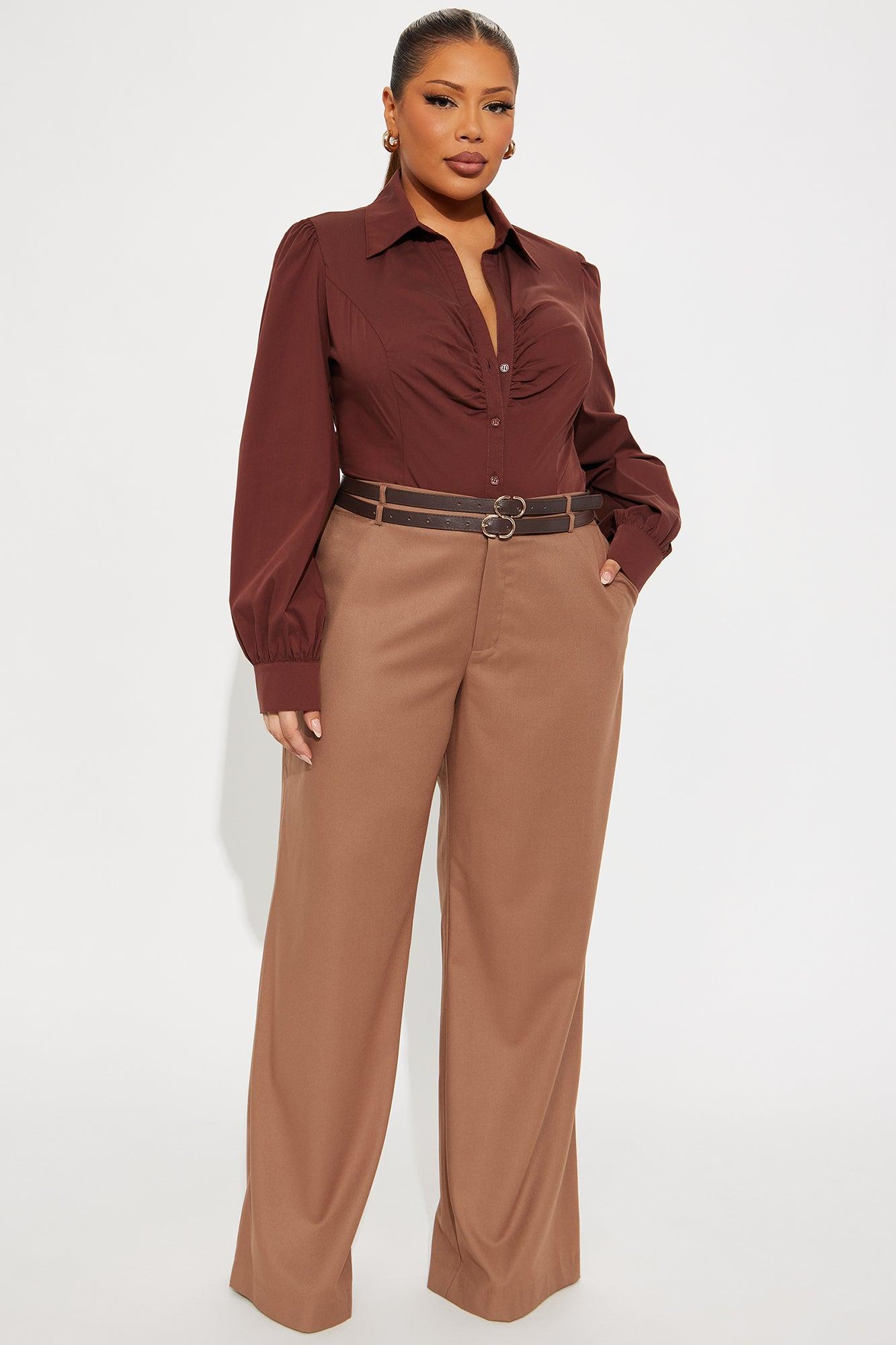 Available In Brown. Wide Leg Trouser Pant Non Stretch Regular 34" Inseam Low Rise Removeable Belt Clasp And Zipper Closure Hand Pockets Faux Back Pockets Shell: 69% Polyester 29% Rayon 2% Spandex Lining: 100% Polyester Imported