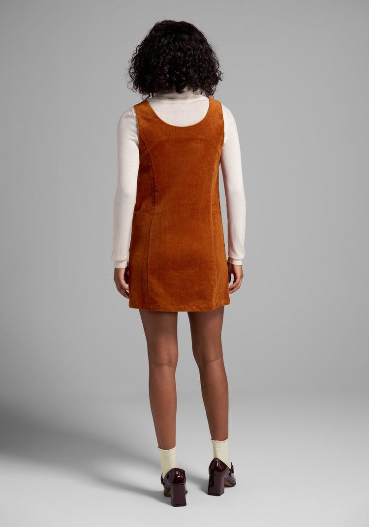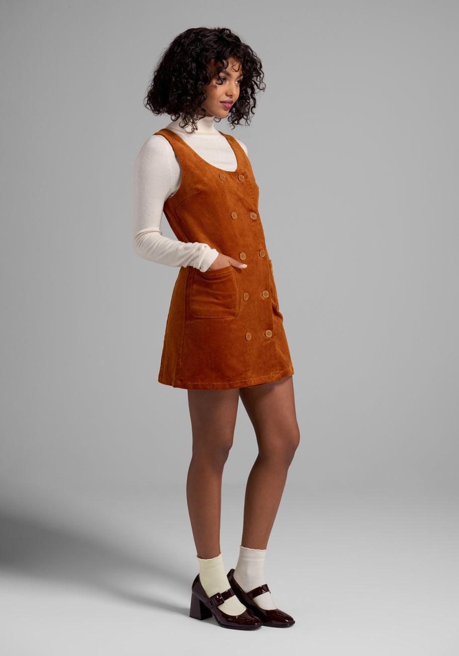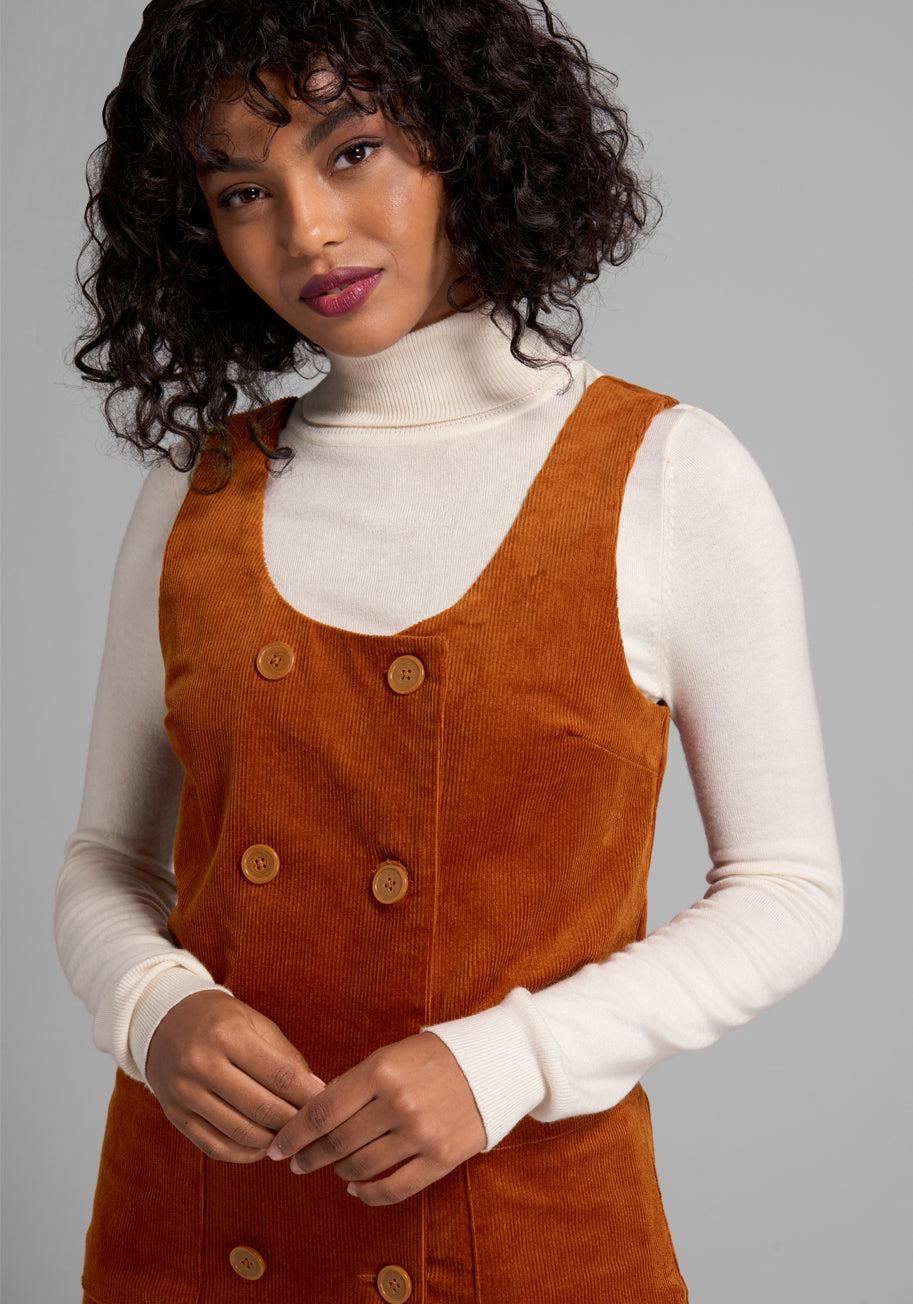 You certainly know how to play your fall fashion to the note in this cinnamon-hued corduroy jumper from our ModCloth namesake label! Made from a slightly stretchy cotton corduroy, this sleeveless pinafore jumper is elevated by double-breasted front button closure and boasts front patch pockets, a coquettish A-line silhouette, and an above-the-knee finish. So perfect for warm layering during colder months, this 70's-inspired rust jumper looks great over a turtleneck and tights, a t-shirt and sneakers, and it can even be styled alone when things start to warm up. 98% Cotton, 2% Spandex Double-breasted button-up closure. Front patch pockets Machine wash cold, lay flat dry Imported Model Measurements: HEIGHT: 5' 9½'' BUST: 32'' WAIST: 26'' HIPS: 38''