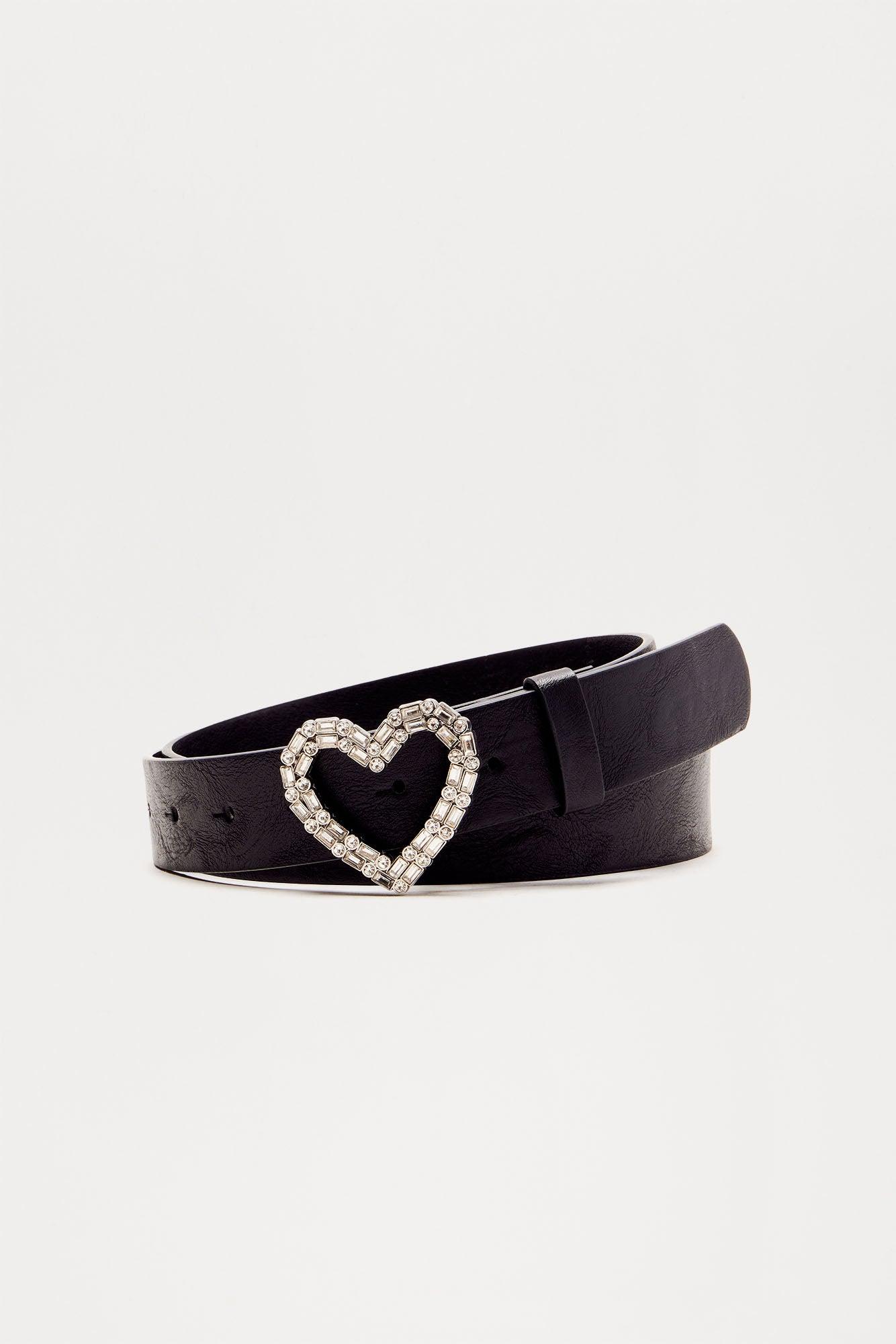Available In Black. Belt Heart Shape Buckle Design Rhinestone Detail Faux Leather Material Length: 40" Imported