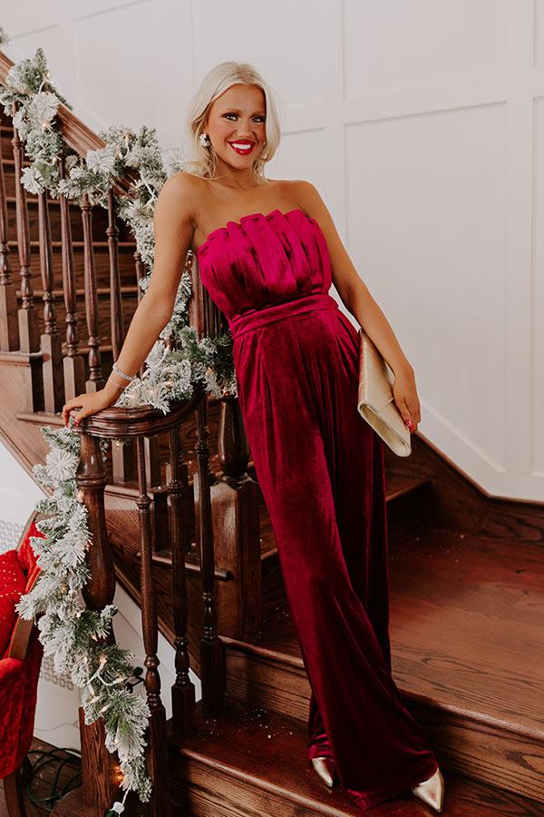 - We are obsessed with this fabulous velvet jumpsuit! - Luxe sangria colored velvet material - Trendy strapless cut - Pleated front bodice feature and figure flattering smocked back - Back zip closure - Functional side pockets - Relaxed pants silhouette that ends in straight ankle length hemlines Measurements S : Bust 26", Hip 34", Inseam 30.5", Length 52.5", Waist 24". M : Bust 28", Hip 36", Inseam 31", Length 53.5", Waist 26". L : Bust 30", Hip 38", Inseam 31.5", Length 54", Waist 28".