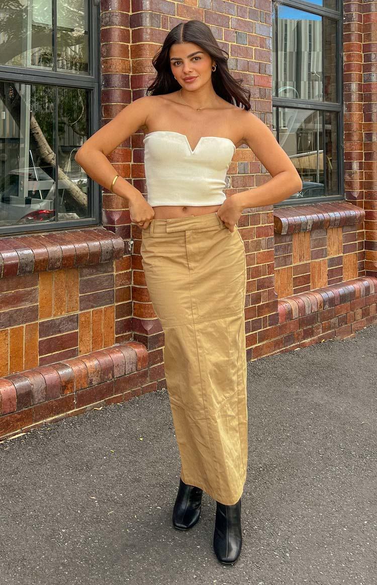 Tan Maxi Skirt HOW TO STYLE The cutest tan maxi skirt perfect for your next winter night out! We love to pair it with a white crop top and silver jewellery for a cool girl vibe - so chic! Or style with a black crop and heels for a dinner outfit you're sure to love. FEATURES Maxi length Unlined Non stretch material Lightweight fabric Center front zipper and button closure Belt loops High back split