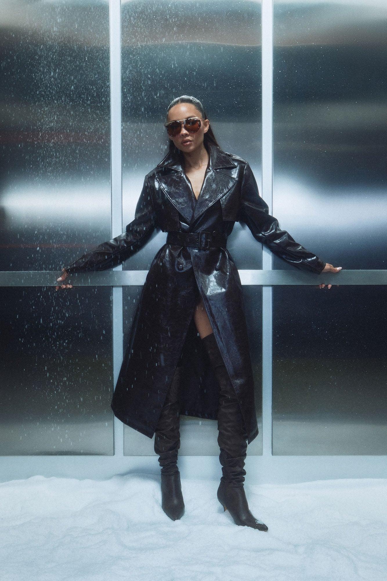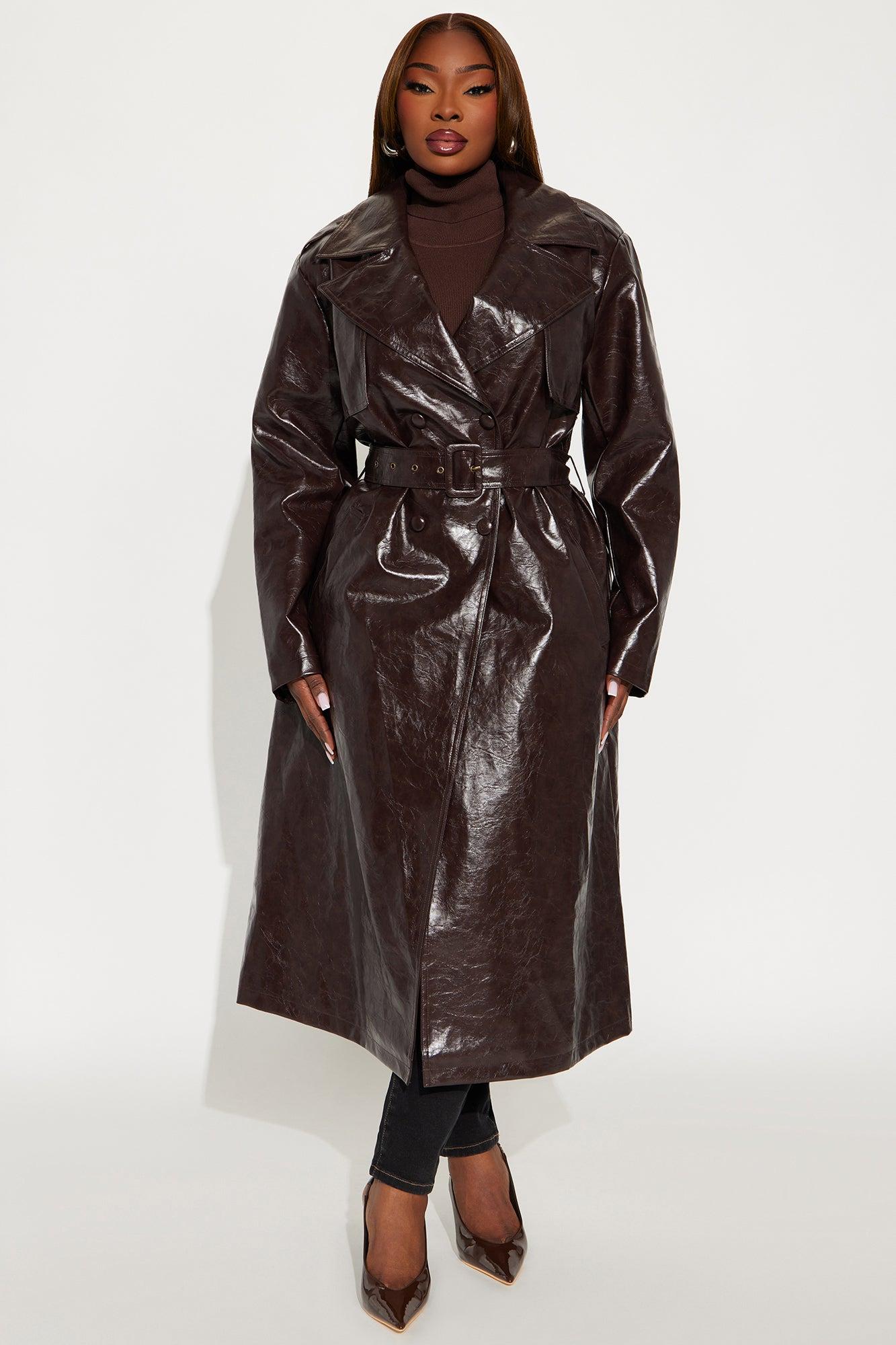 Available In Blue And Chocolate. Trench Coat Lapel Collar Long Sleeve Faux Leather Belted Fully Lined Disclaimer: To Keep The Aesthetic Of This Garment, Please Follow The Care Instructions Carefully. Self Coating: 100% Polyurethane Backing: 100% Polyester Lining: 100% Polyester Imported California Proposition 65WARNING: Cancer and Reproductive Harm - www.P65Warnings.ca.gov.