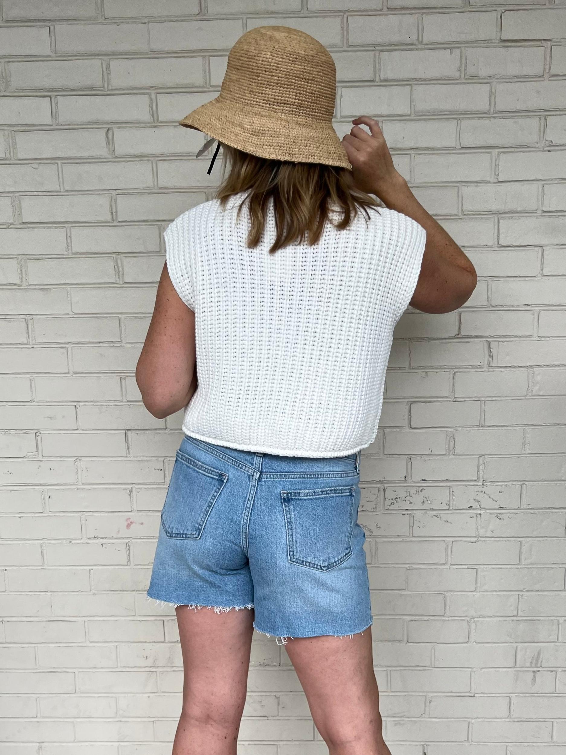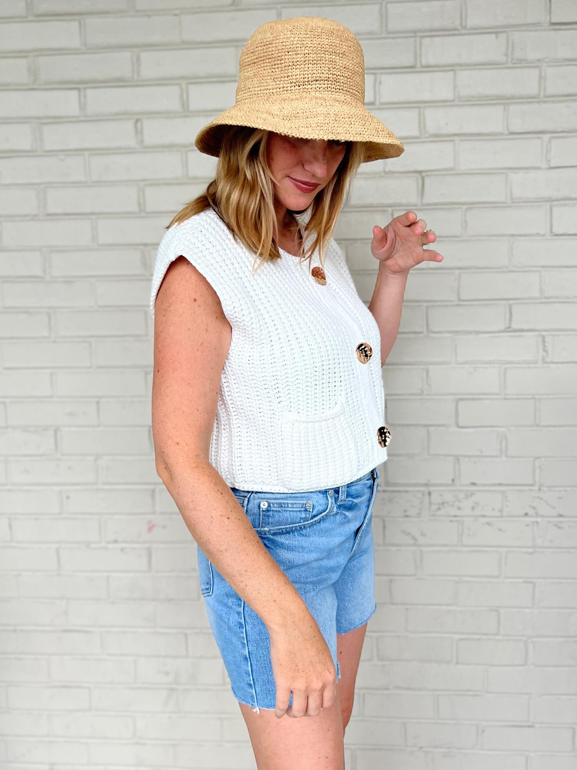 Knit your look together with the Mya Sweater Vest! This white sleeveless top features a cropped length, perfect for layering over a dress or pairing with high-waisted jeans. The gold button front adds a touch of elegance and charm. Stay stylish and cozy with this versatile piece.