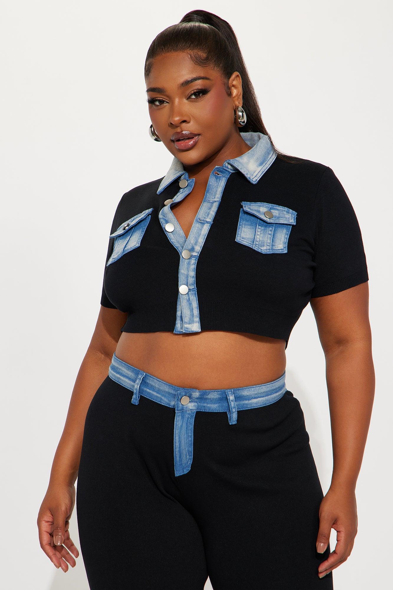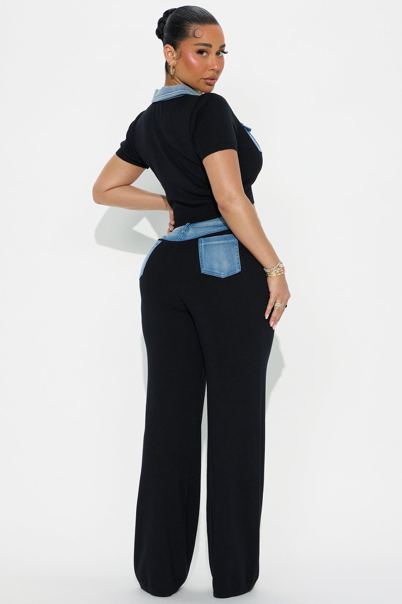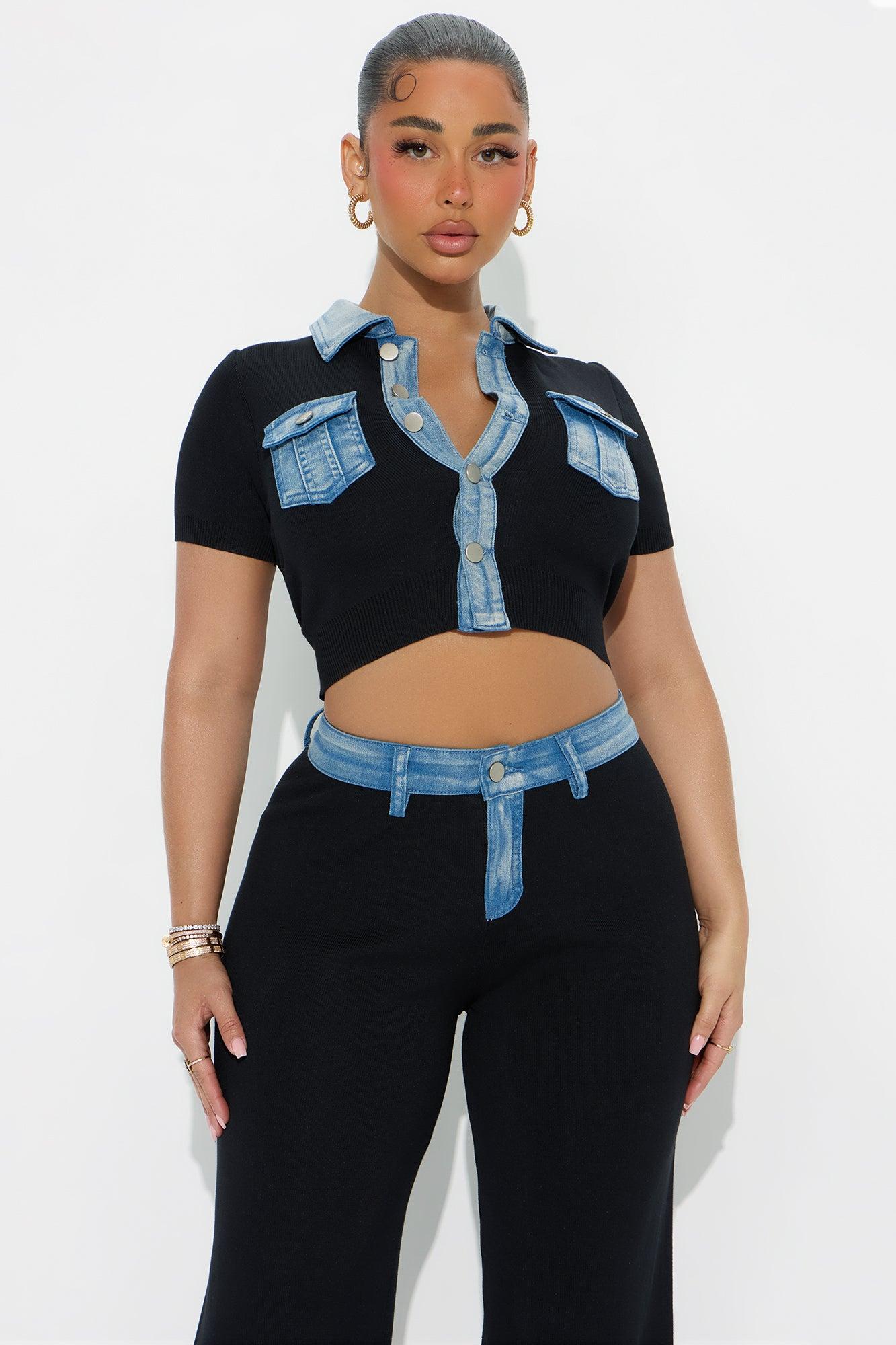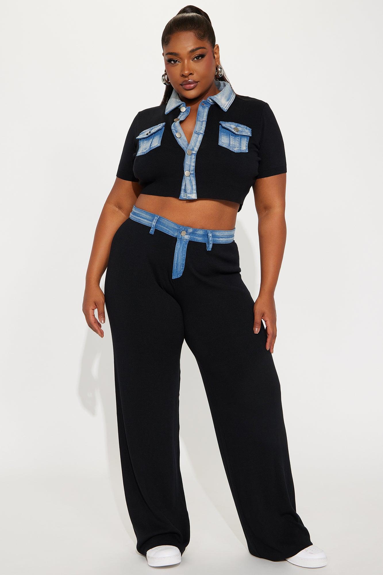 Available In Black And Taupe. Top And Pant Set Stretch Pockets Top Button Down Pant Zipper & Button Detail 33" Inseam Self: 72% Viscose 28% Polyester Contrast: 70% Cotton 28% Polyester 2% Spandex Imported California Proposition 65WARNING: Cancer and Reproductive Harm - www.P65Warnings.ca.gov.