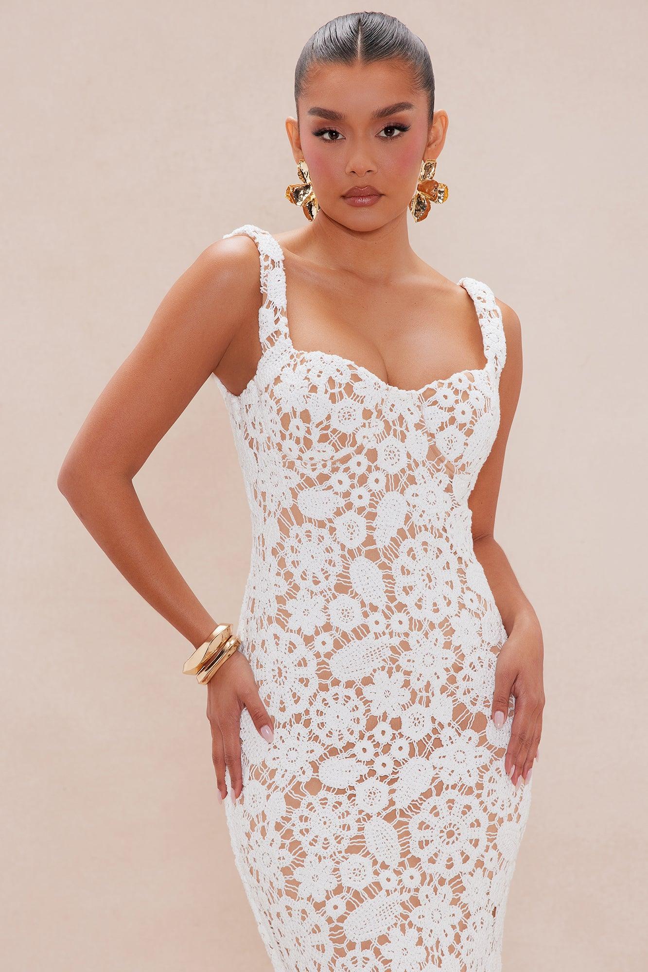 Available In White/combo And Chartreuse. Crochet Midi Dress Sleeveless Sweetheart Neckline Padded Bra Cups Underwire Slit Back Zipper Closure Lined Non Stretch Length From Neckline= 38.5'' Disclaimer: Embroidery Design Placement May Vary Shell 95% Cotton 5% Nylon Lining 95% Polyester 5% Spandex Imported