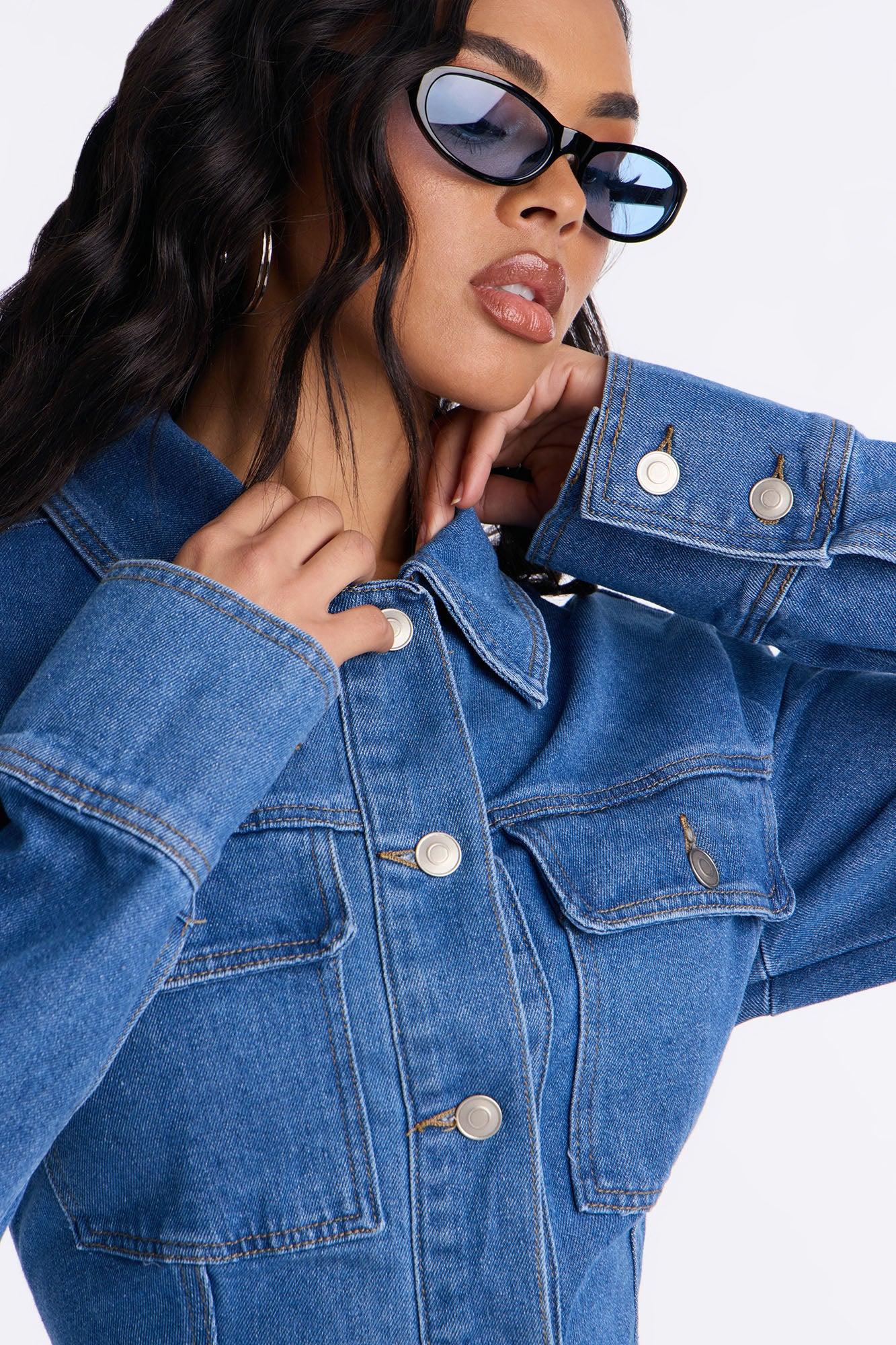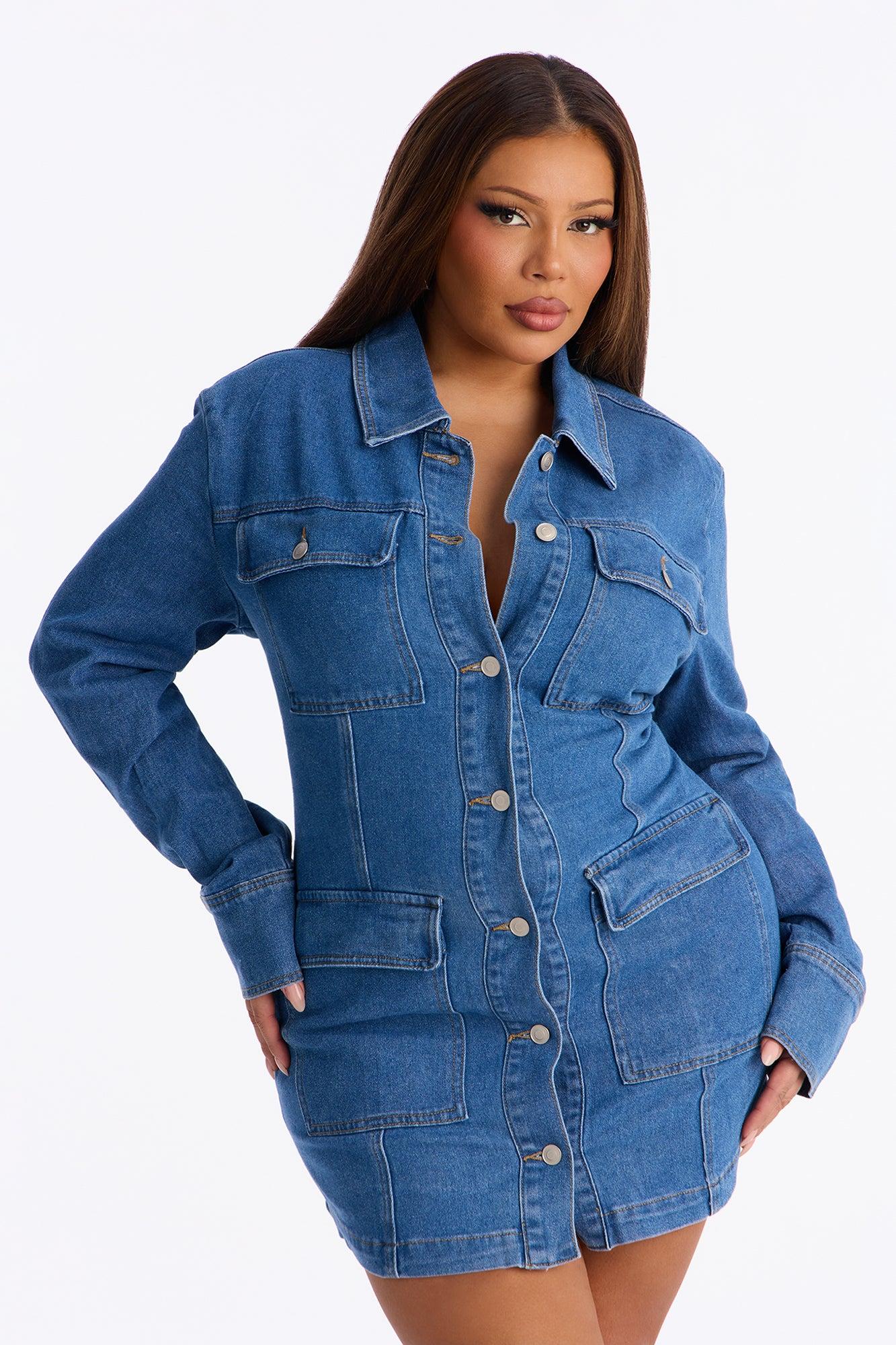 Available In Denim. Denim Mini Dress Collar Long Sleeve Button Up Pockets Stretch Length Measured Flat = 32" Disclaimer: Due To The Printing Process A Difference In Saturation May Occur. Each Garment Is Unique. 63% Cotton 35% Polyester 1% Rayon 1% Spandex Imported