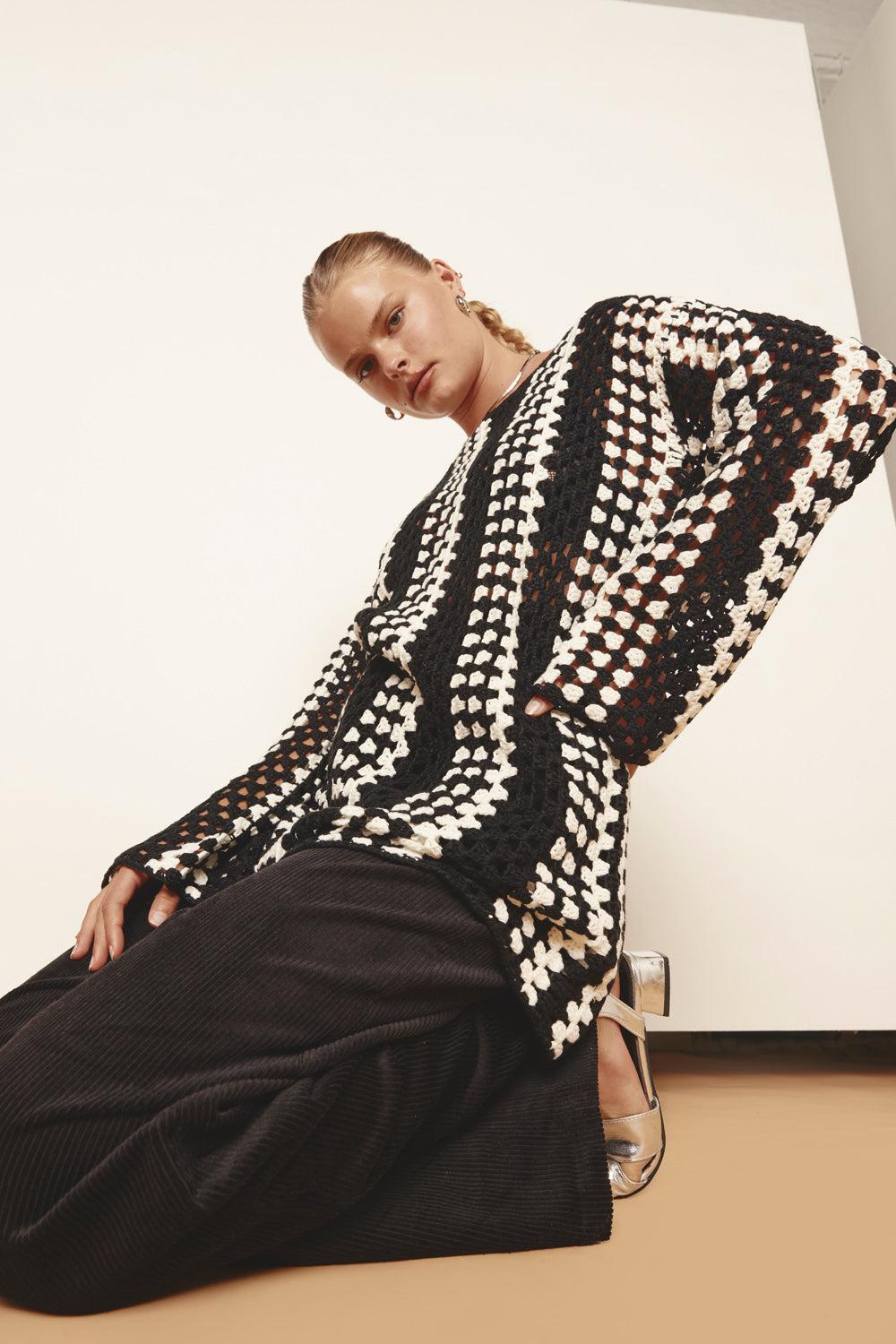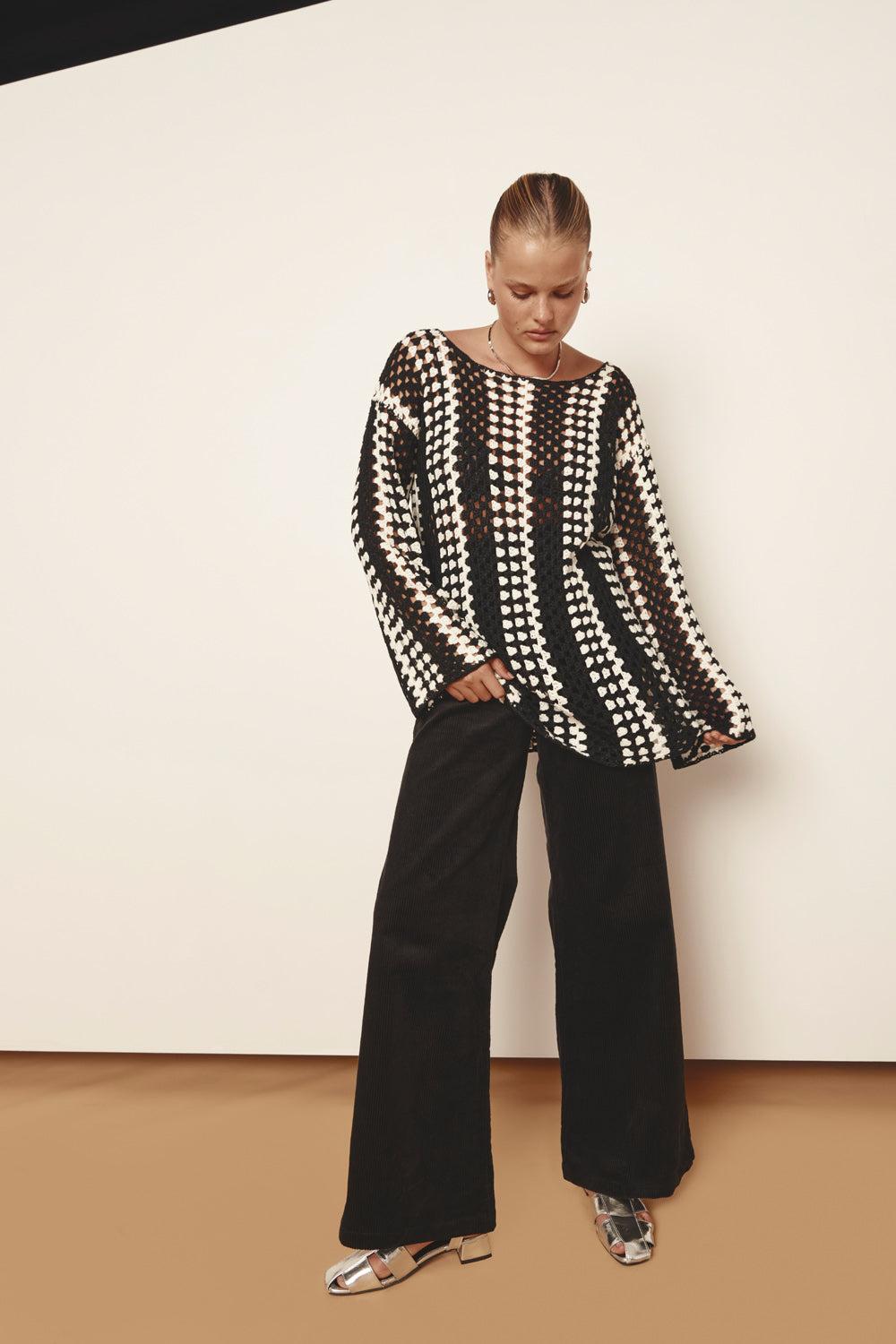 Meet The Myra, a crochet mini dress in contrasting black and white stripes. It's a relaxed fitting style with stretch that will have you feeling bold, yet effortless and comfortable. Please note belt and undergarments worn are not included. Details 100% Acrylic Sheer Relaxed fit Length 75cm / 29.5in (taken from a size S shoulder to hem) Cold Hand Wash / Cool Iron Designed in Australia Size & Fit Zoe is 171cm / 5ft 7.5in - wearing size AU S View our size guide for more information