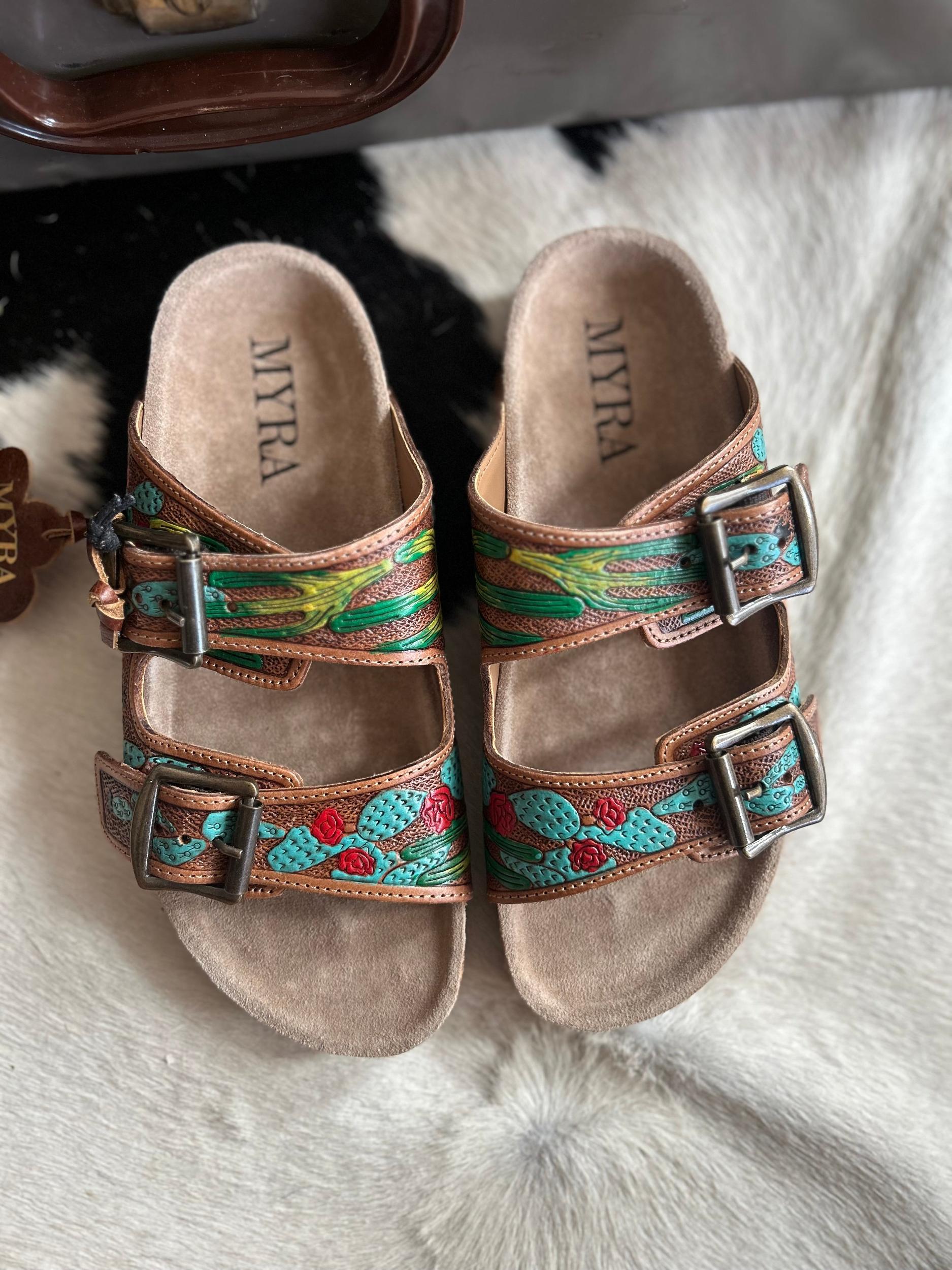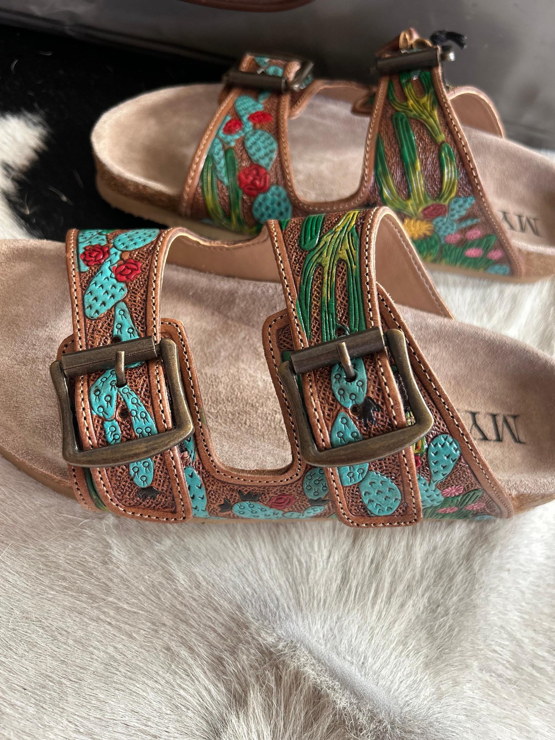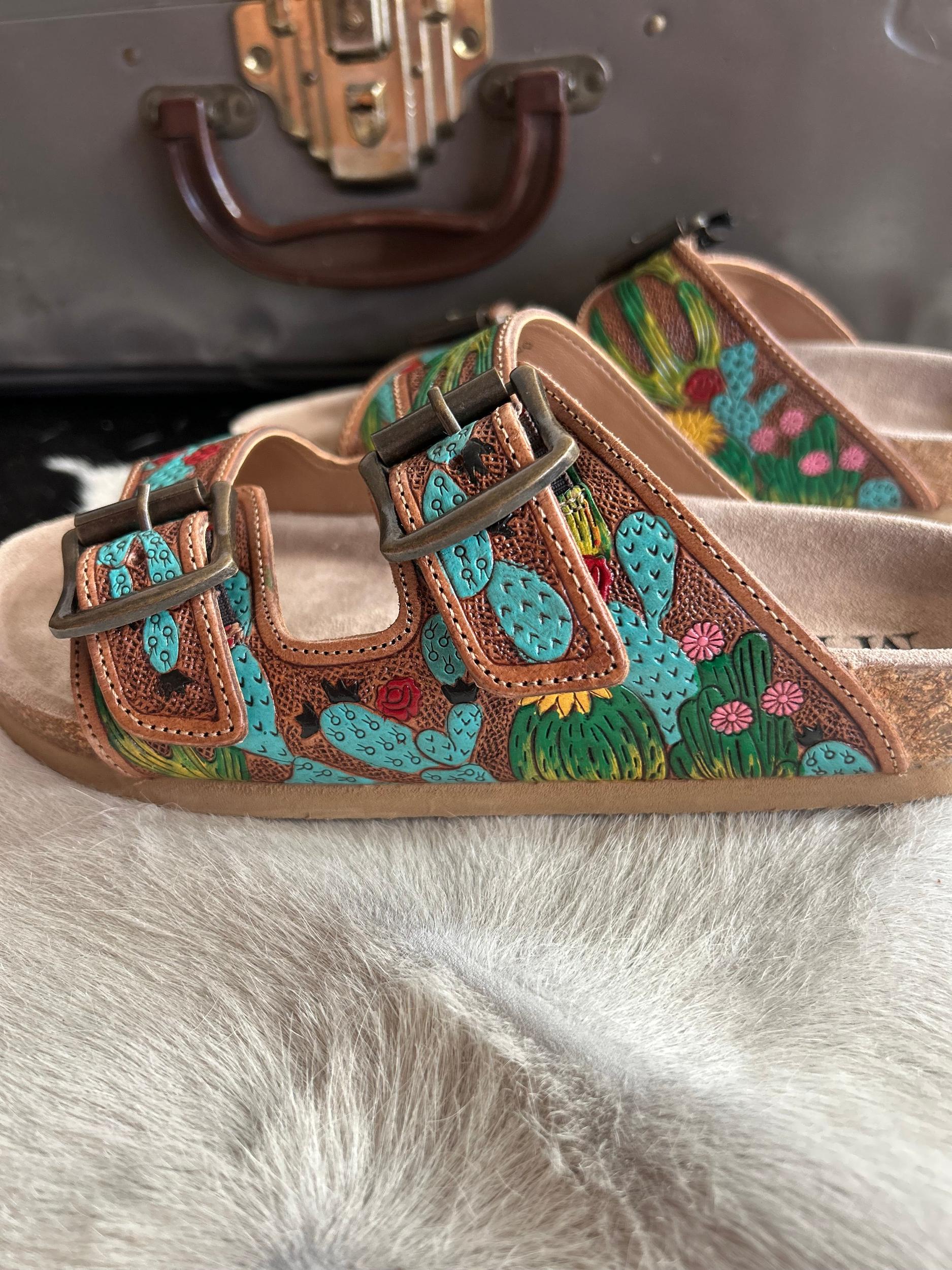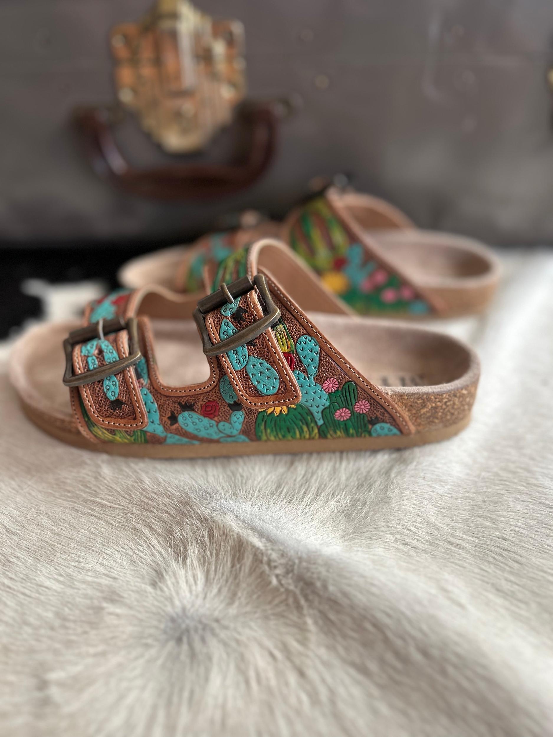 Myra Falling Feather Sandals I Gussied Up Online Boutique Introducing the Myra Falling Feather Sandals - the perfect combination of style and comfort. Made with genuine leather, these sandals feature a unique cactus design, tooled and painted leather, and a double strap for a secure fit. Slip on these burkie sandals and step into ultimate comfort. True to Size