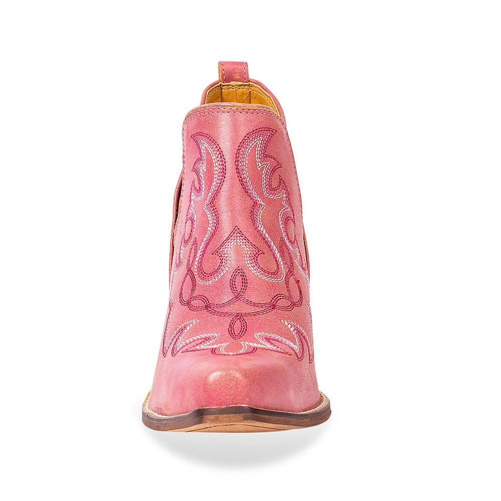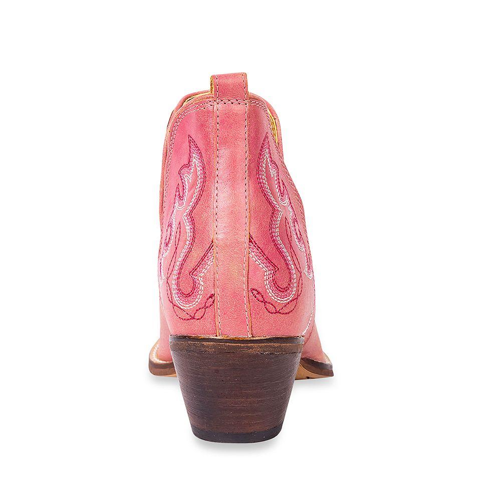 Myra Pink Maisie Leather Stitched Booties | Gussieduponline By Myra Genuine pink leather notched ankle booties with decorative contrast stitching in tan and white. Cushioned sole for optimal comfort. Pointed toe. Size down 1 size, these booties run big! 2" heel