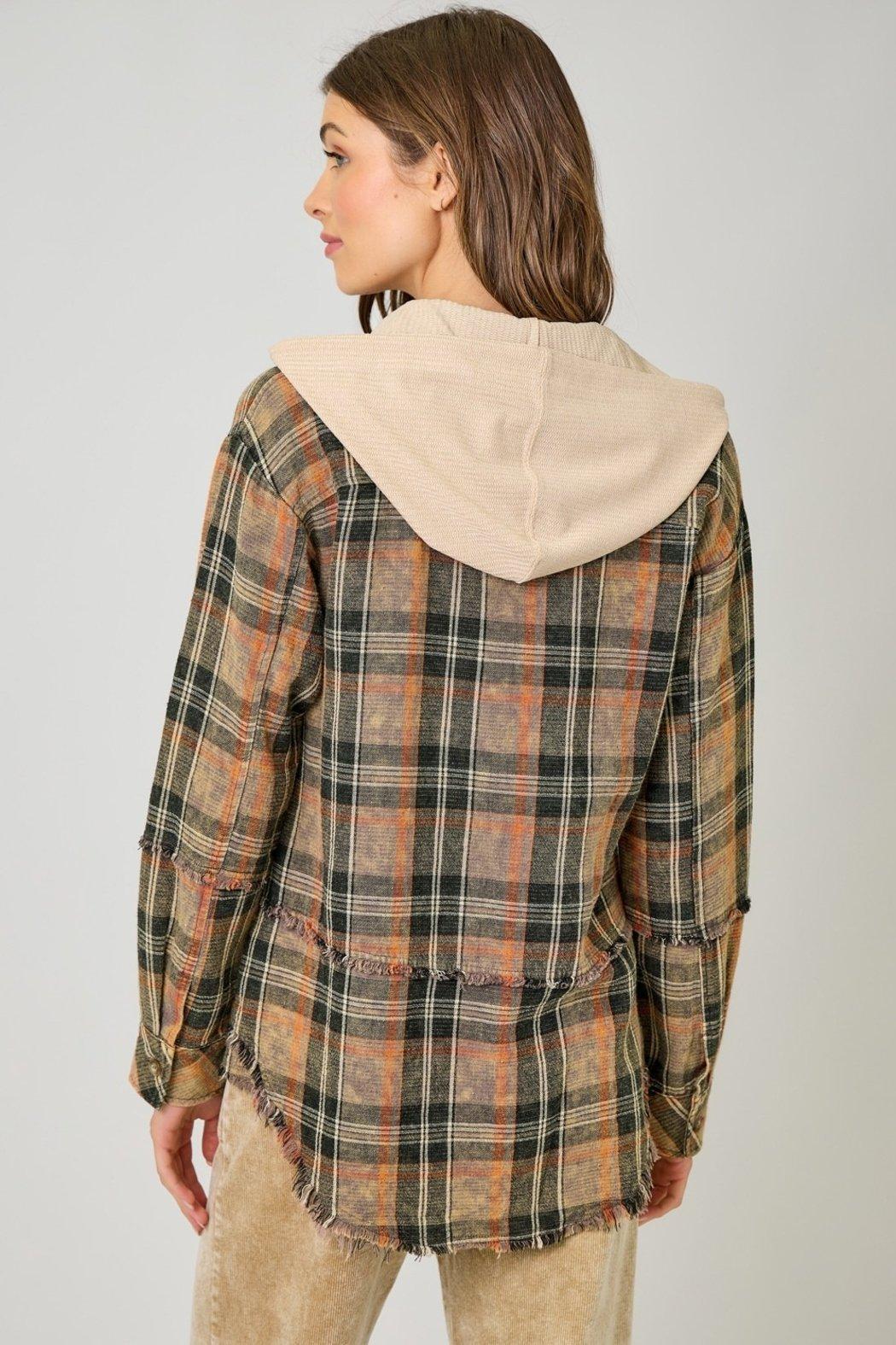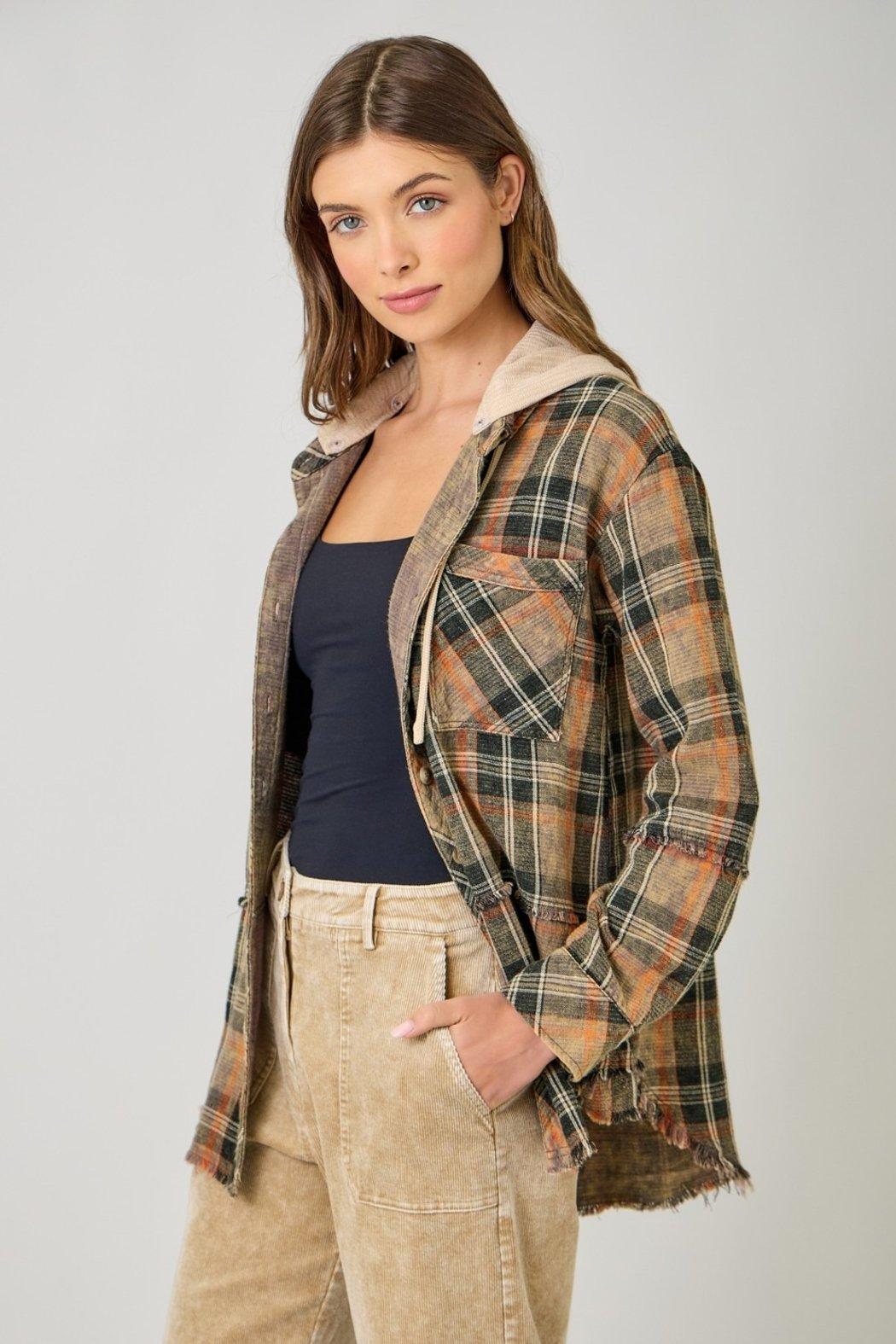 Add a rugged edge to your casual wardrobe with this Hoodie Jacket. Crafted from soft, breathable double-layered fabric, this jacket features a vintage-inspired plaid pattern in earthy tones with a cozy hood for added warmth and style. Raw edge seams and a slightly distressed finish give it a laid-back, lived-in look. Designed with a relaxed fit, button-front closure, and a single chest pocket, it’s perfect for layering over your favorite basics for an effortlessly cool, everyday outfit.