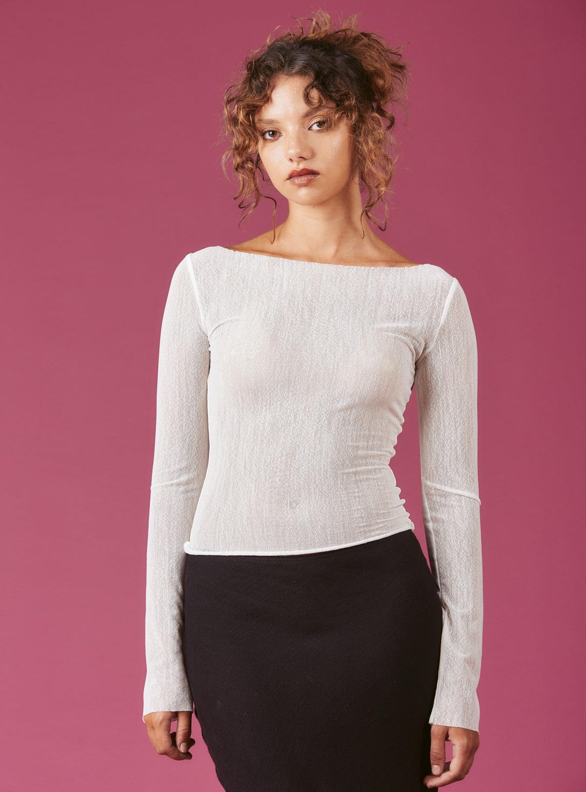 Raw edge mesh long sleeve with a wide boat neck. Perfect for layering Model is 5'8" and wearing a size S. 100% Polyester Imported Sku: UWT-1719