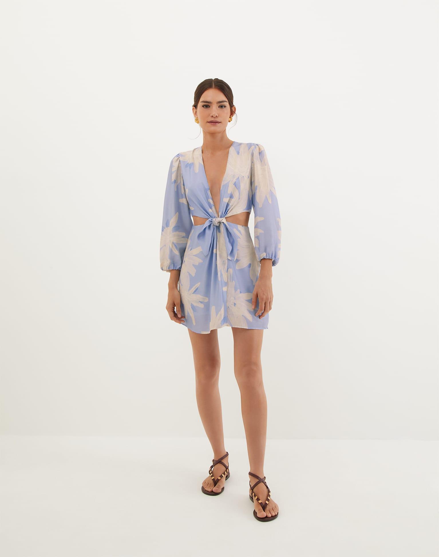 The ViX Nadi Short Dress is a mini dress with ¾ sleeves featuring elasticized cuffs and a plunging V-neckline. It includes striking dual side cutouts, a central knotted detail, a smocked back, and a back closure for a chic, well-fitted silhouette. Style the Nadi Short Dress with heels and ViX accessories for a resort-read look. Features: Mini style dress ¾ bell sleeves Elasticized cuffs Plunging V-neckline Dual side cutouts Smocked back Closures at back Style# VR252057