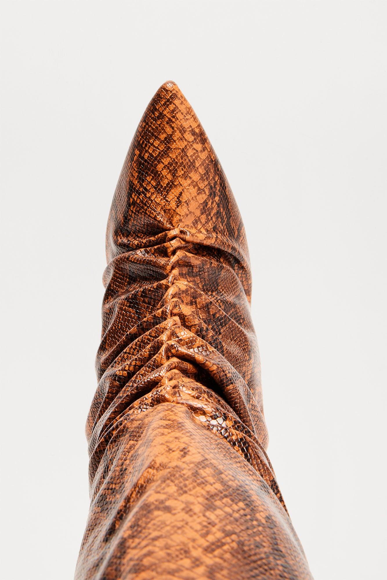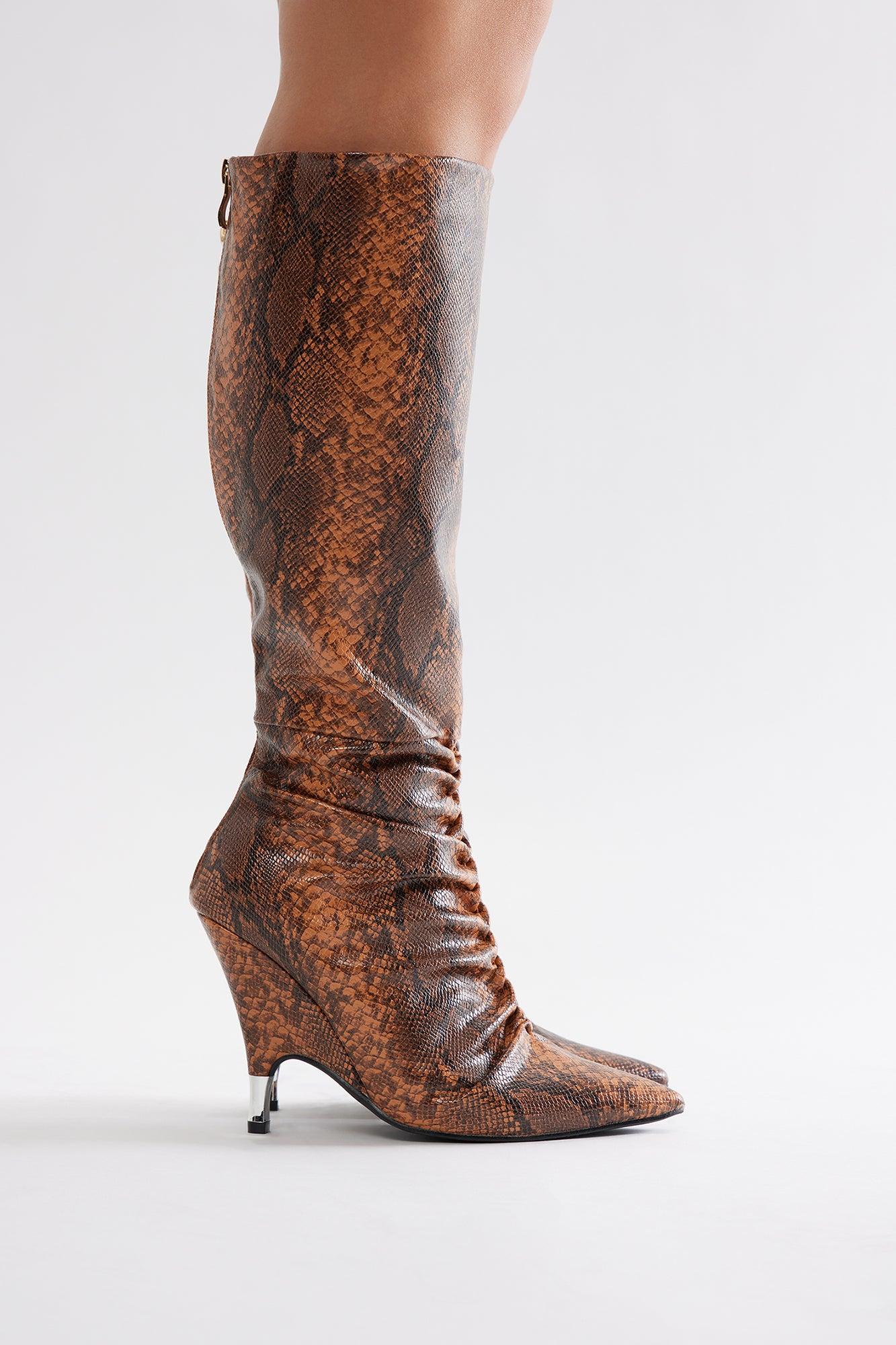 Available In Brown Combo. Knee High Heeled Boots Zipper Detail Pointed Toe Ultra High Heel Imported