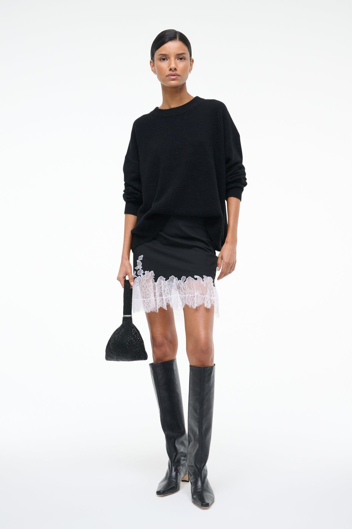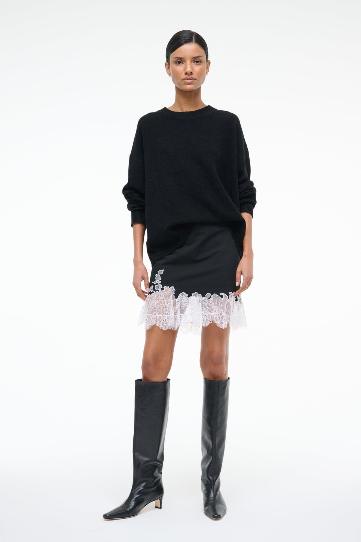 The Nadia Mini Skirt is a fitted mini with contrast cut-out lace detailing at the hem. This style features a hidden zipper.
