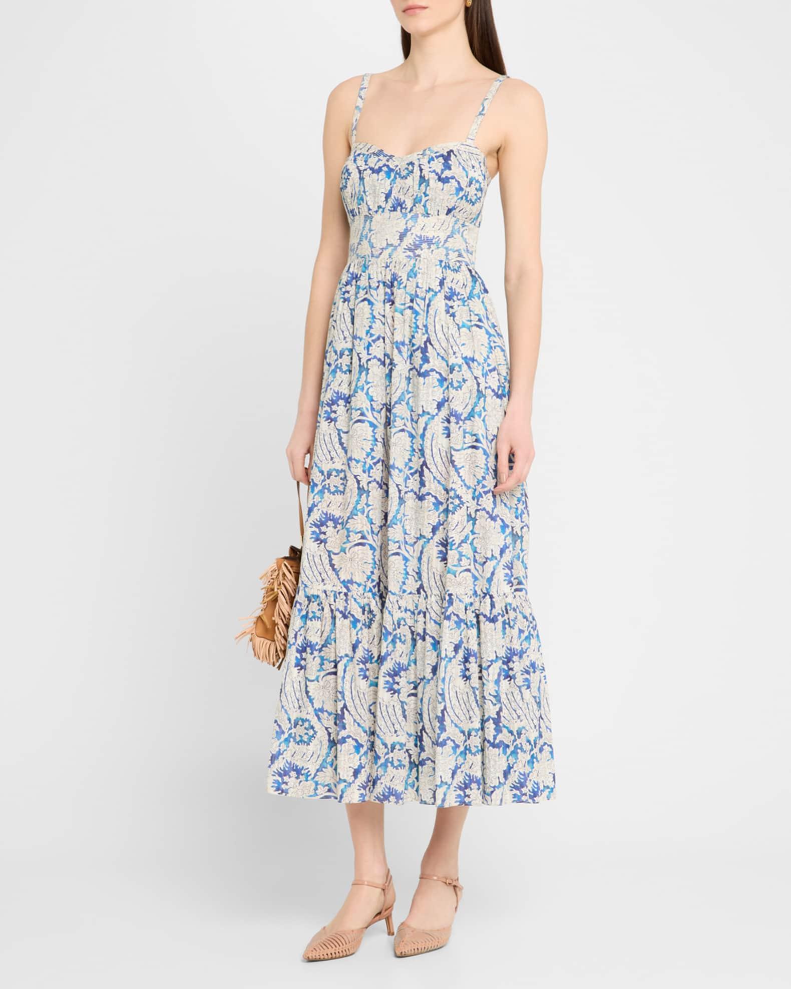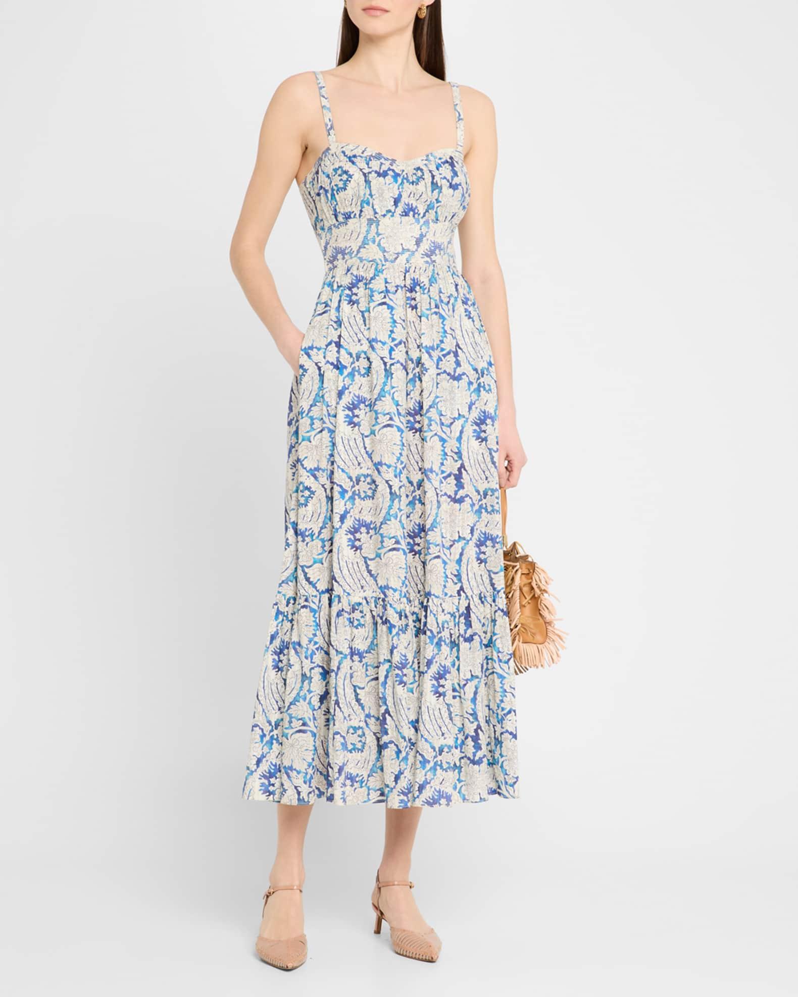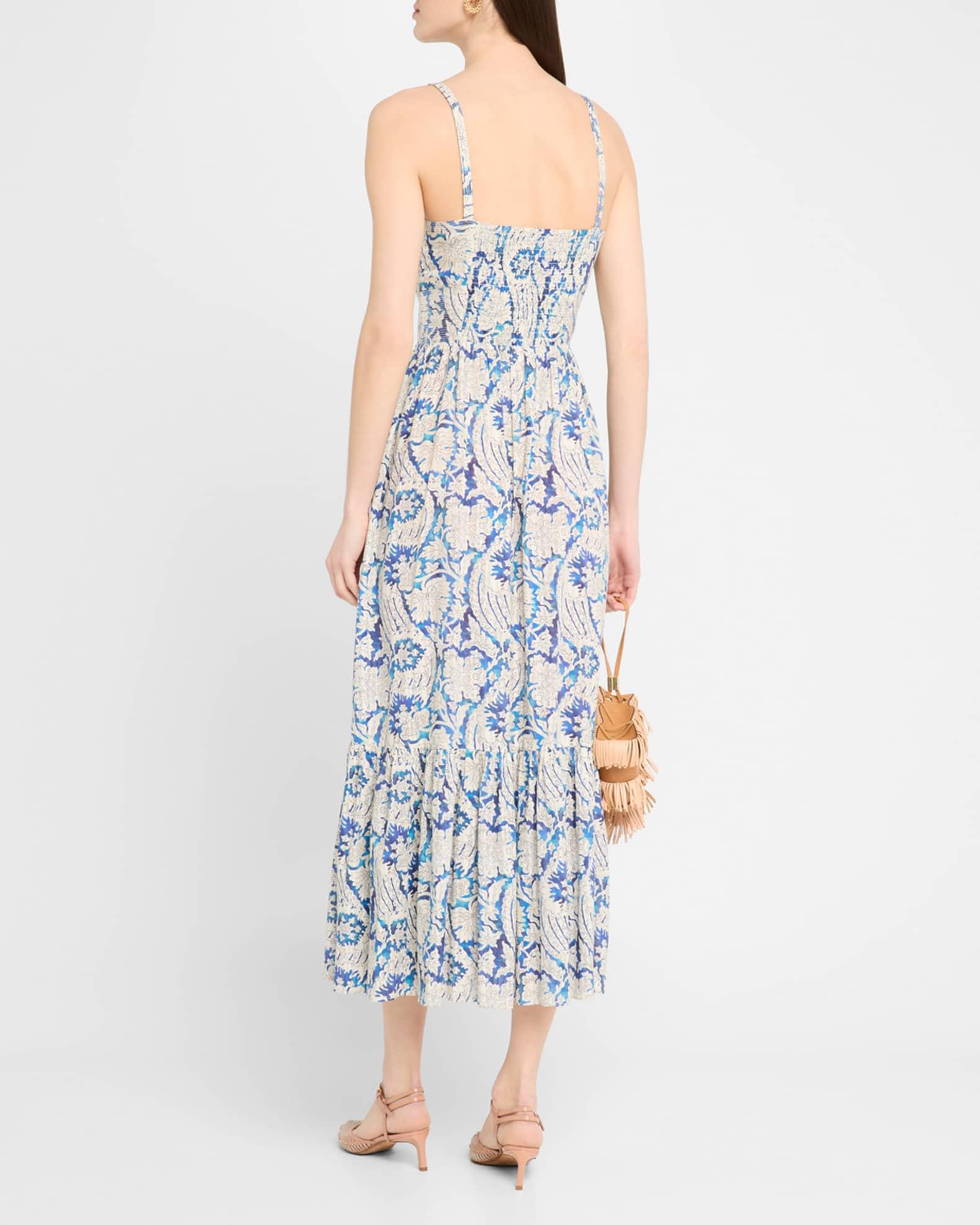 Ulla Johnson "Nadine" dress showcases a cinched waistline and a vibrant damask pattern with swirling shapes Sweetheart neckline Sleeveless Wide straps Smocked back Side seam pockets Hem falls below the knee A-line silhouette Slipover style Cotton/viscose Hand wash Imported